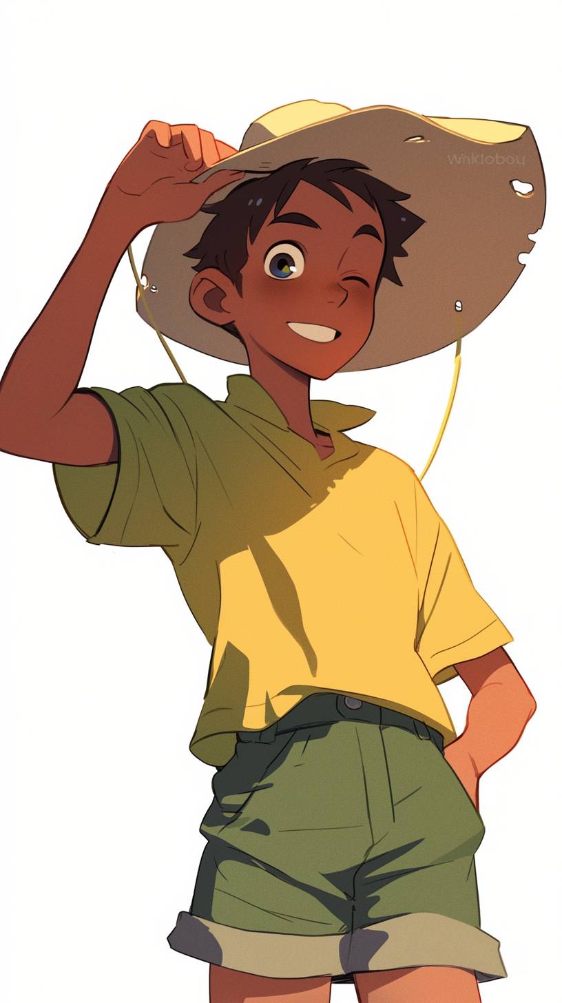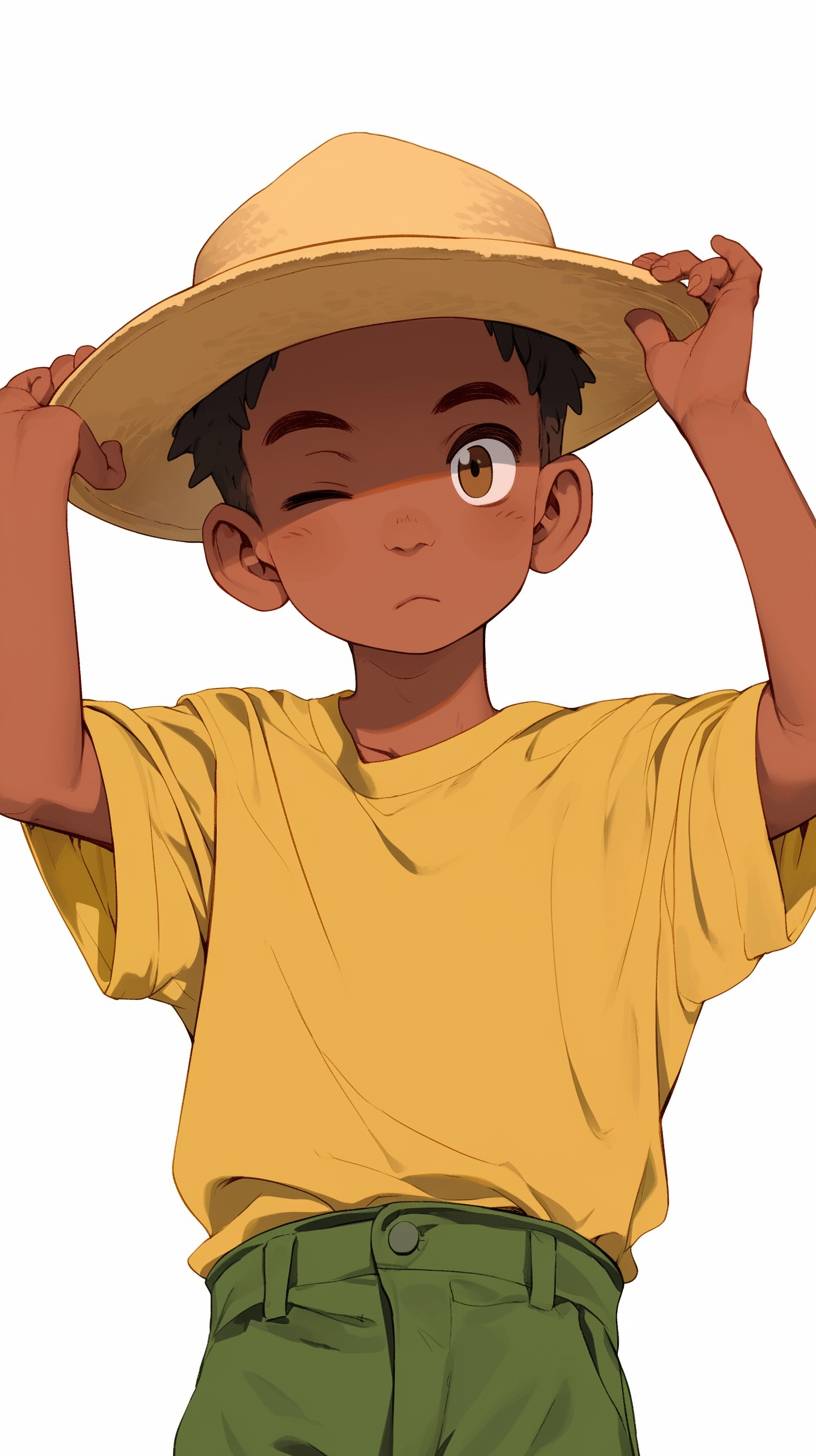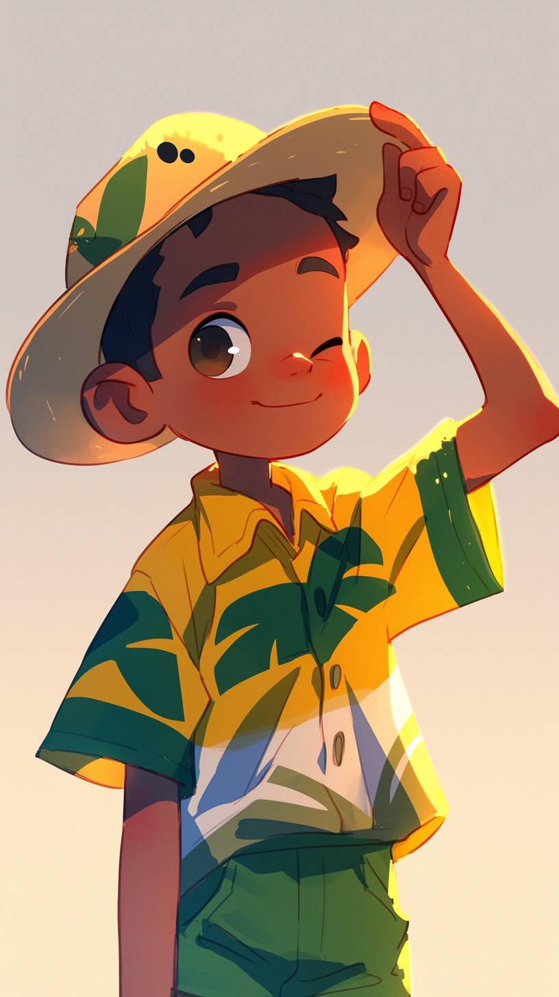 Timmy takes off the hat. The hat winks and disney Pixar art style light green short and shirt .and Timmy is black american and is wearing a mustard boater hat --ar 9:16 --niji 6