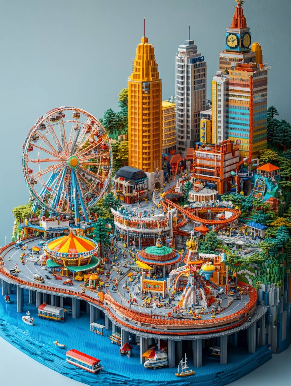 Lego model,coastal city,Urban elevated roads, underground comprehensive spaces, amusement parks, commercial centers, landmark buildings,cutaway art,best quality,32k,large scene --ar 3:4 --stylize 250 --v 6.1