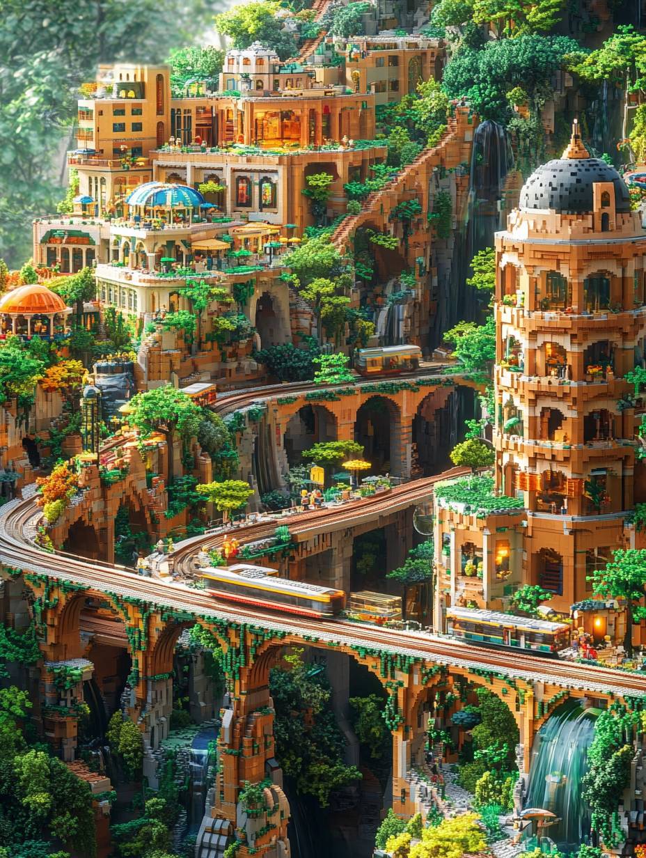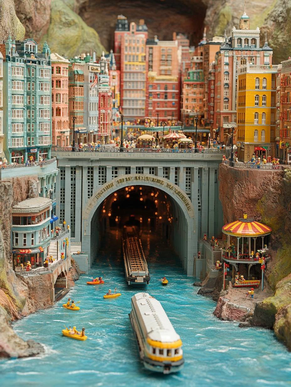 Модель Lego, прибрежный город, городские эстакады, подземные комплексные пространства, парки аттракционов, торговые центры, знаковые здания, вырезанное искусство, лучшее качество, 32k, большая сцена
