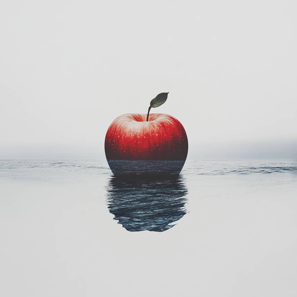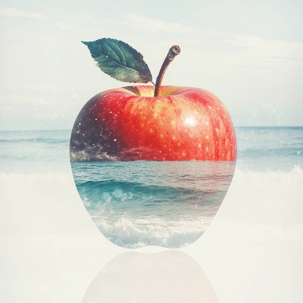 Создайте сюрреалистичную цветную фотографию с двойной экспозицией, на которой изображены яблоко и море. Фон должен быть минималистичным и белым.