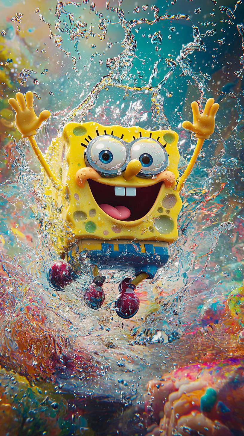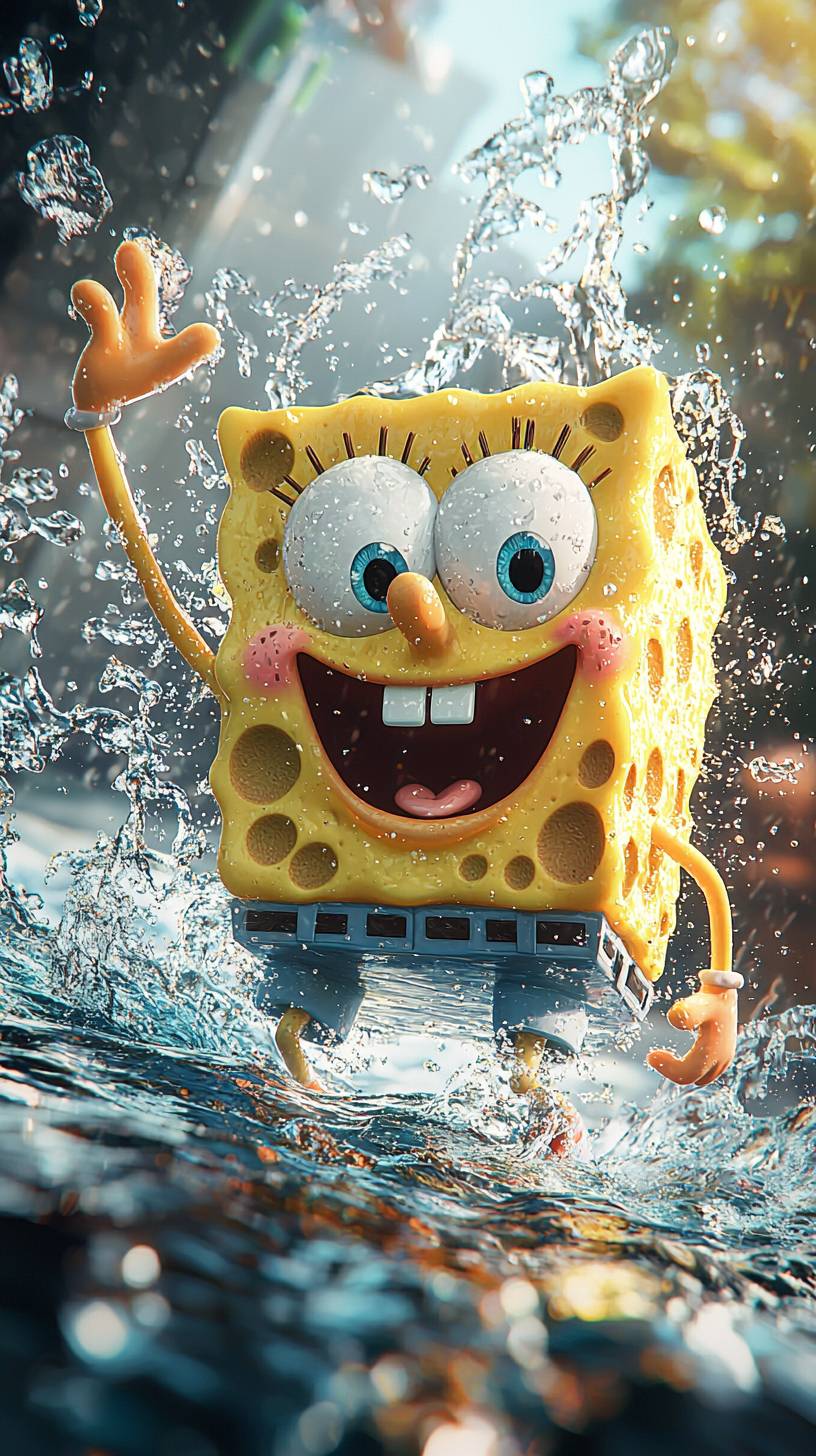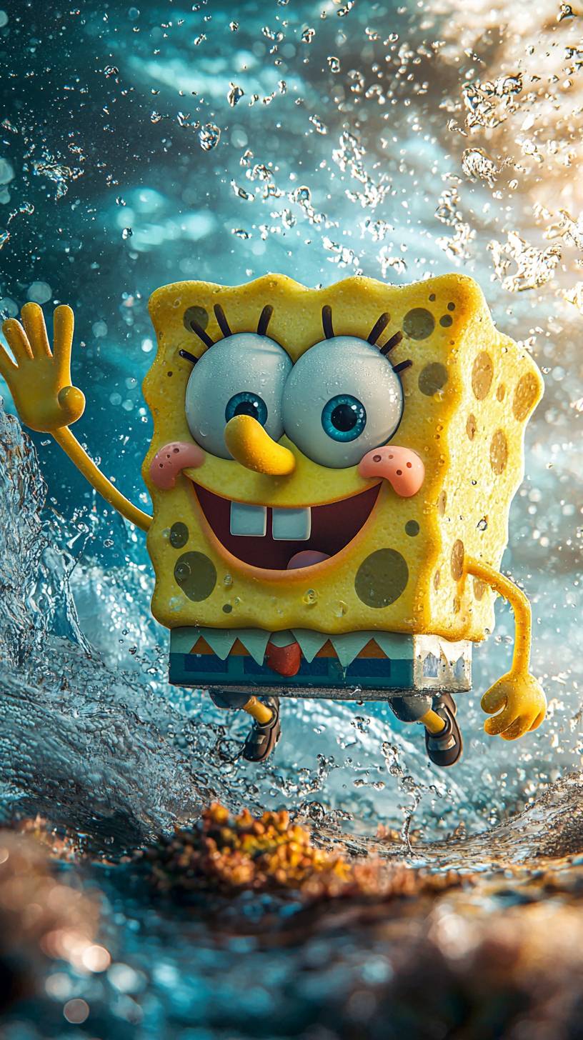 Generate a poster, SpongeBob SquarePants from the cartoon SpongeBob SquarePants, , Waving his left hand, A happy expression, Look ahead., Splashes of crystal water, Bright colors, Filming like a movie, Canon EOS R6 Mark II style, Sharp-focused, high-resolution, High detail, 8K, --ar 9:16 --quality 2 --v 6.1