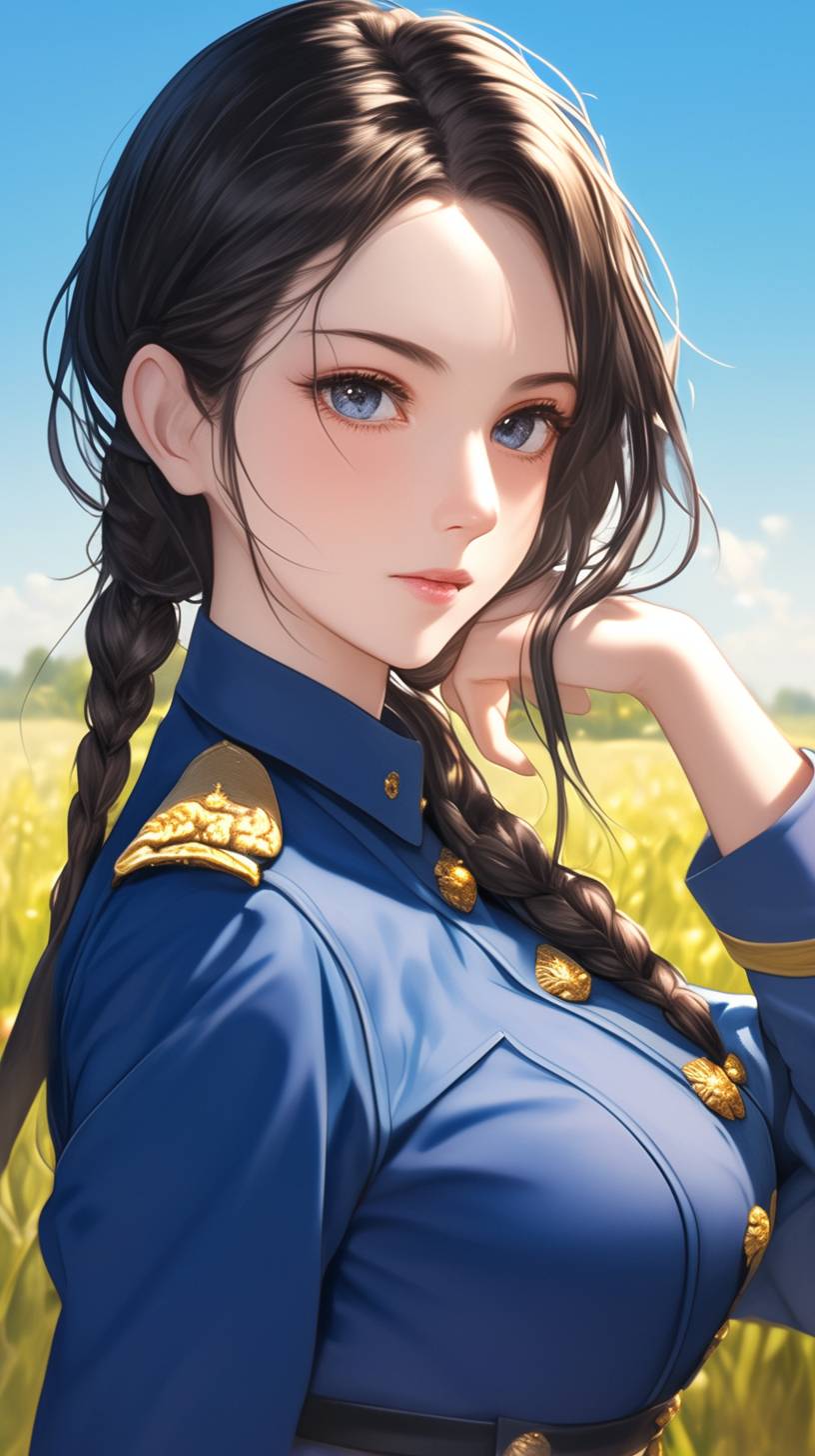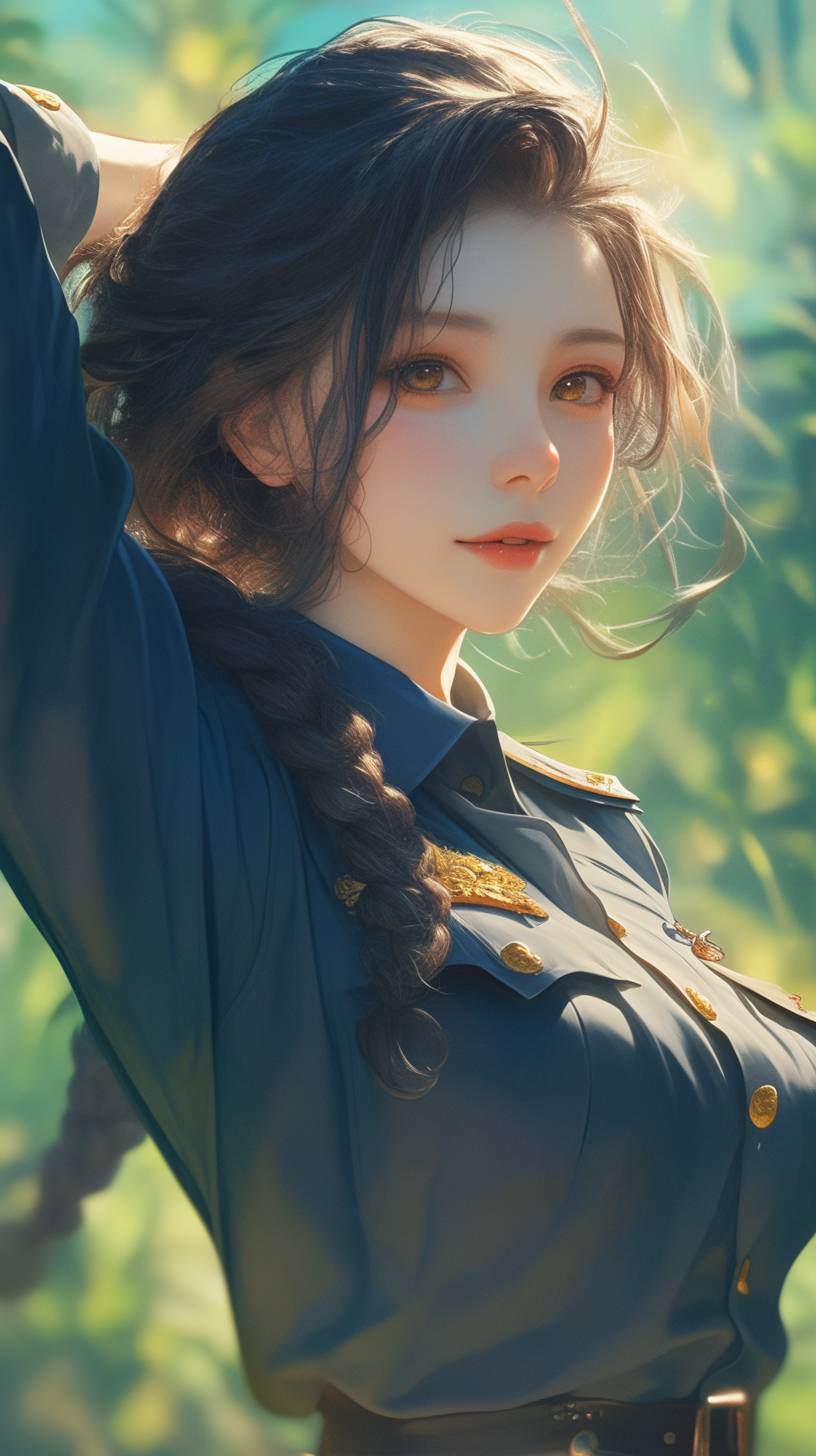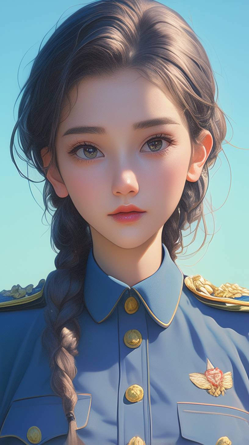 Chinese modern style, 18-year-old girl, elegant and vigorous, beautiful with black hair styled in braided pigtails hanging on her shoulders, wearing a blue military uniform shirt, with a wild outdoor background, 4K. --ar 9:16 --niji 6
