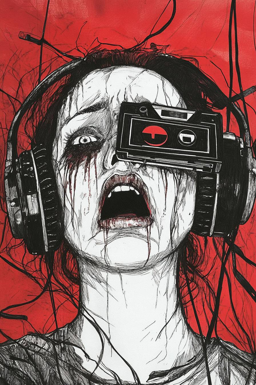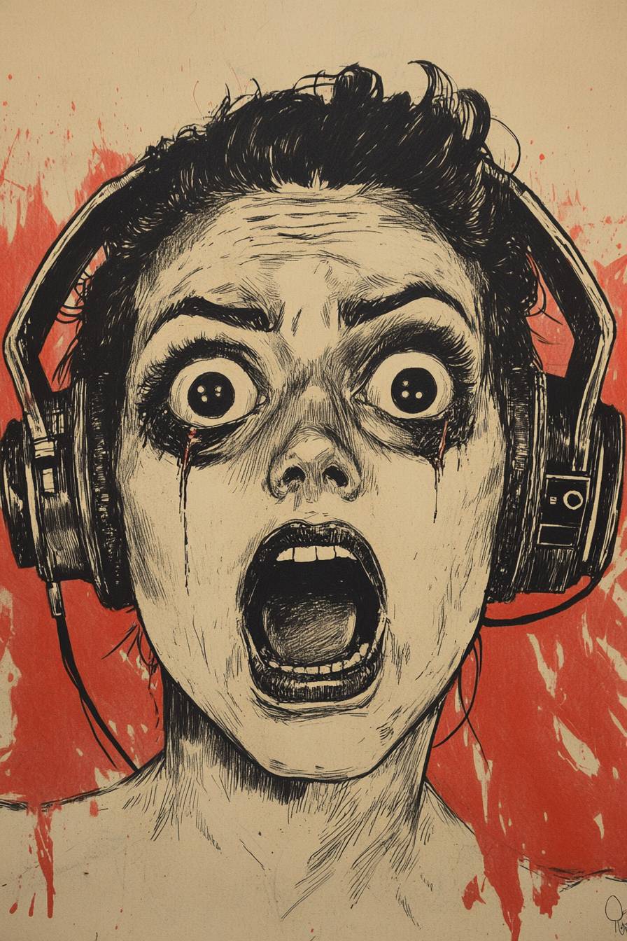 Женщина в старинных наушниках, страх на ее лице, с кассетной лентой, эскиз, простое линейное искусство, хоррор, пулп-арт.