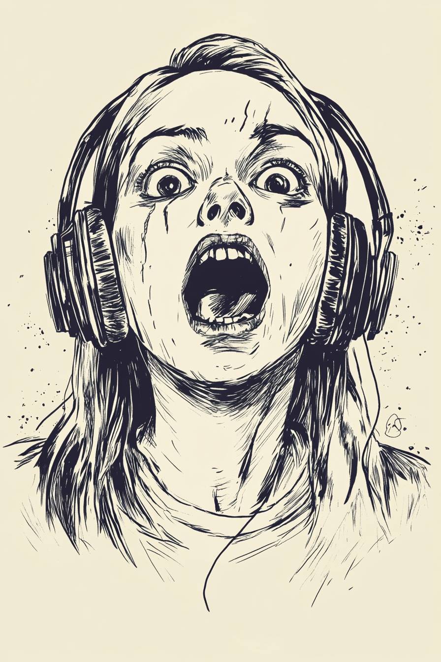 woman wearing old school headphones, cassette tape, fear on her face, sketch, simple line art, horror, pulp art, --ar 2:3 --v 6.1