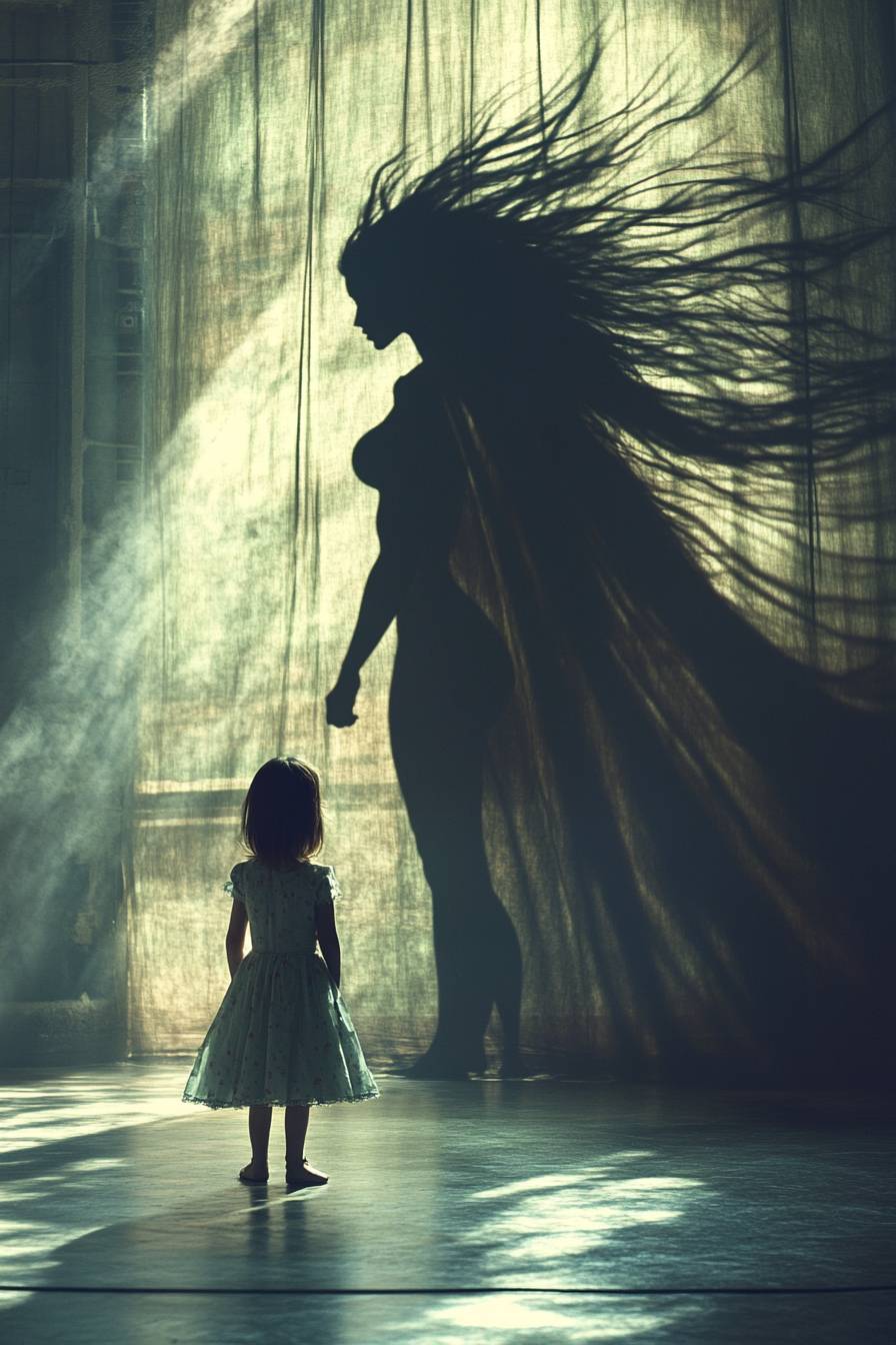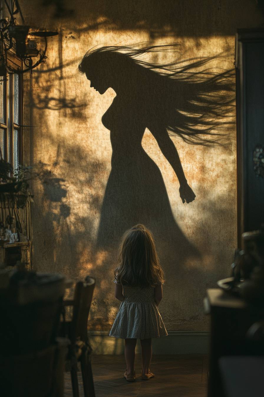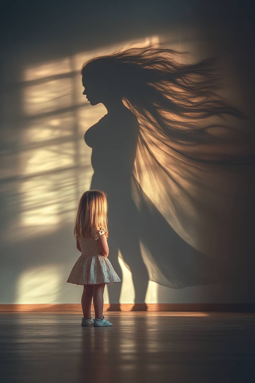 Фотография маленькой девочки, стоящей посреди мягко освещенной комнаты. Камера расположена под низким углом, на уровне глаз девочки, с использованием 35-мм объектива для захвата широкого вида сцены. От ее ног и выше, тень, проецируемая на стену за ней, превращается в силуэт взрослой женщины-супергероя с развевающимися на ветру волосами и плащом. Освещение организовано так, чтобы тень была резкой и заметной на стене. Атмосфера наполнена теплом, надеждой и силой, используя мягкий рассеянный свет и нежные цвета.