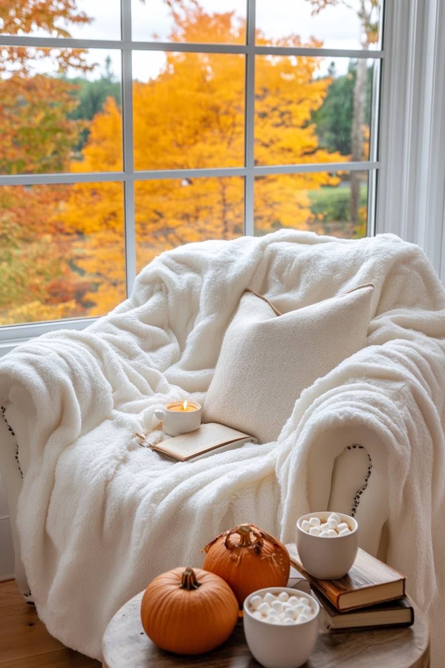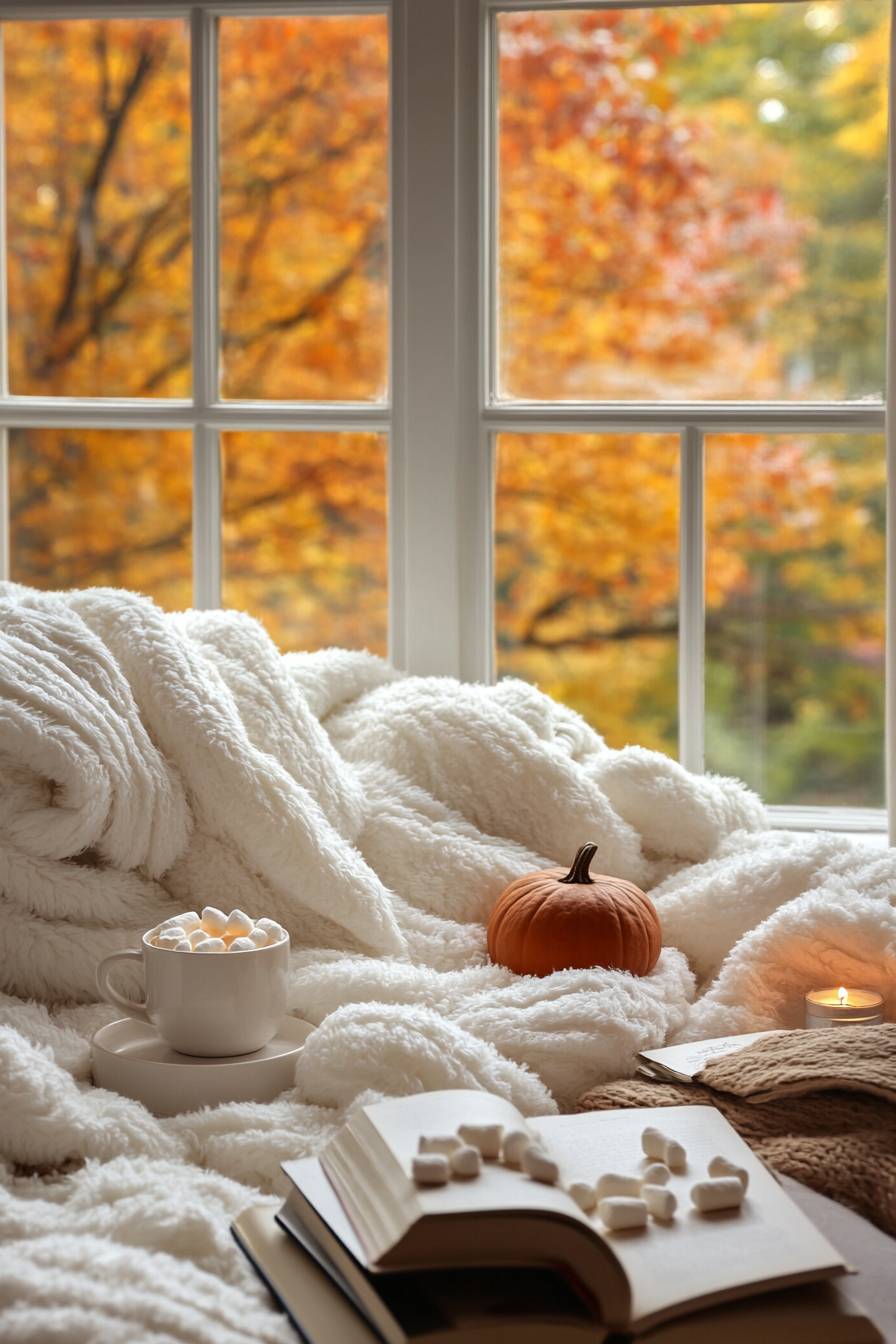 A cozy fall scene featuring an oversized white blanket, a cup of hot cocoa with marshmallows on the table next to it, and some small pumpkins placed around in front of a window overlooking autumn leaves outside. A cozy reading nook with books, candles, and warm blankets, a simple yet elegant style, a warm color palette of orange, yellow, brown, and black, soft lighting creating an inviting atmosphere, but still fairly light and bright --ar 2:3 --v 6.1