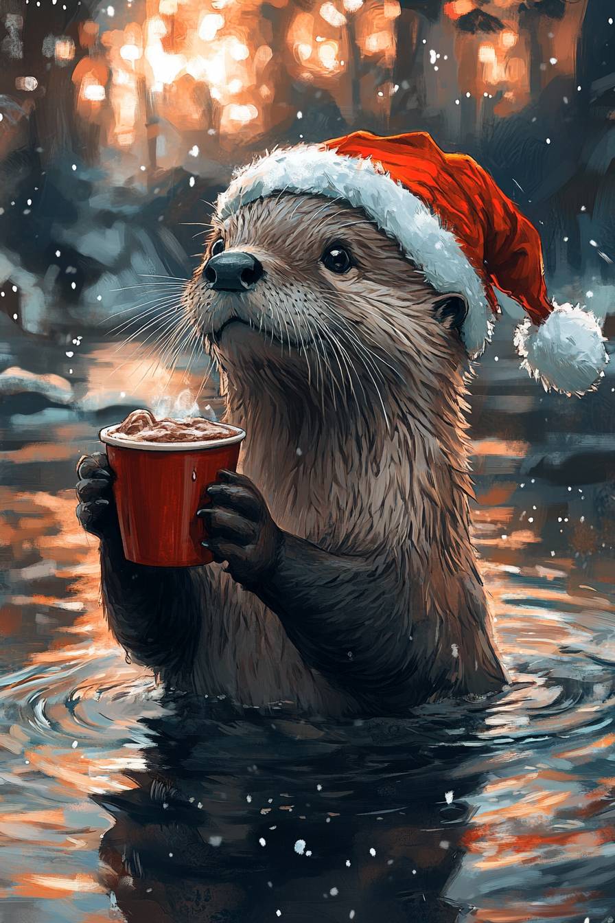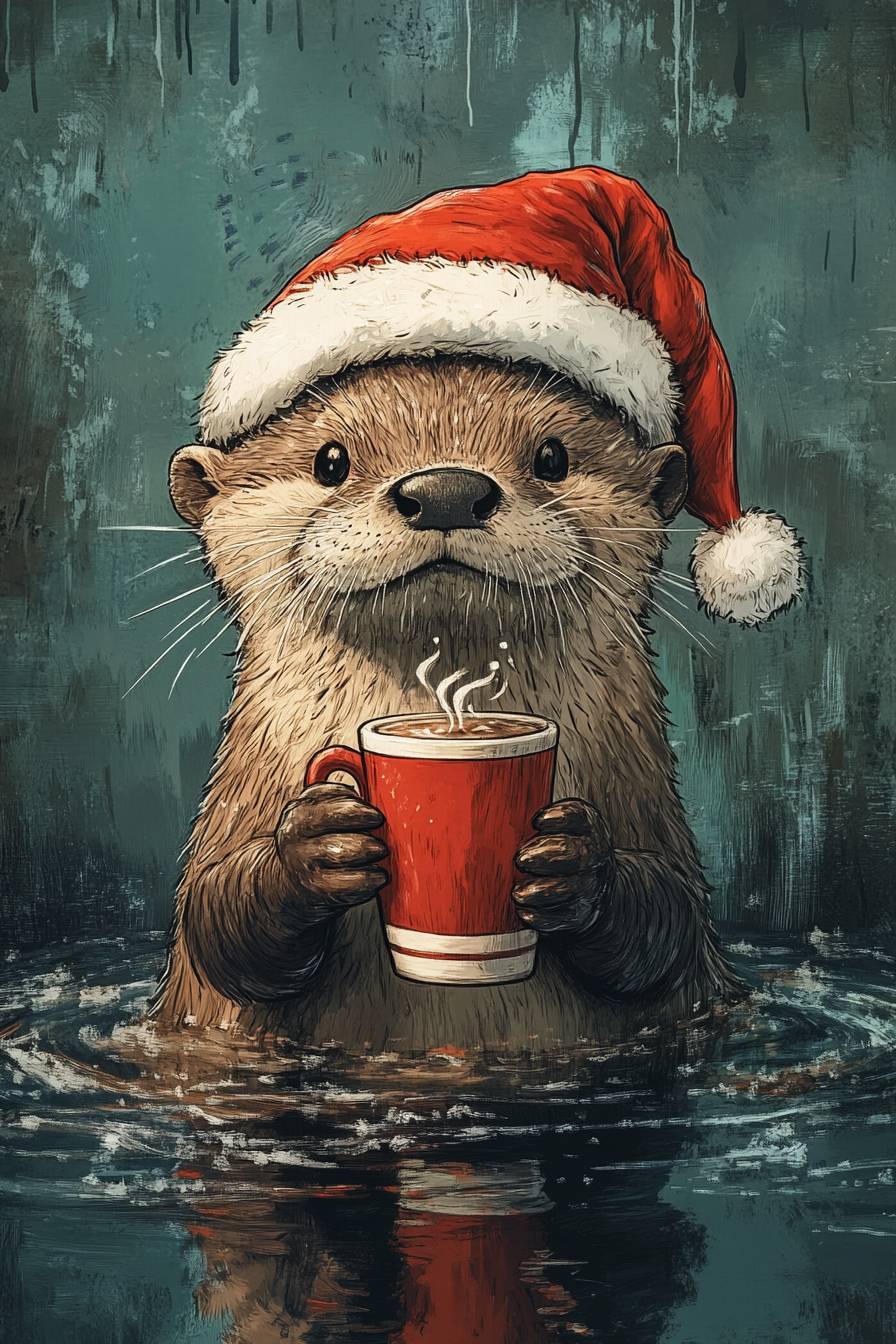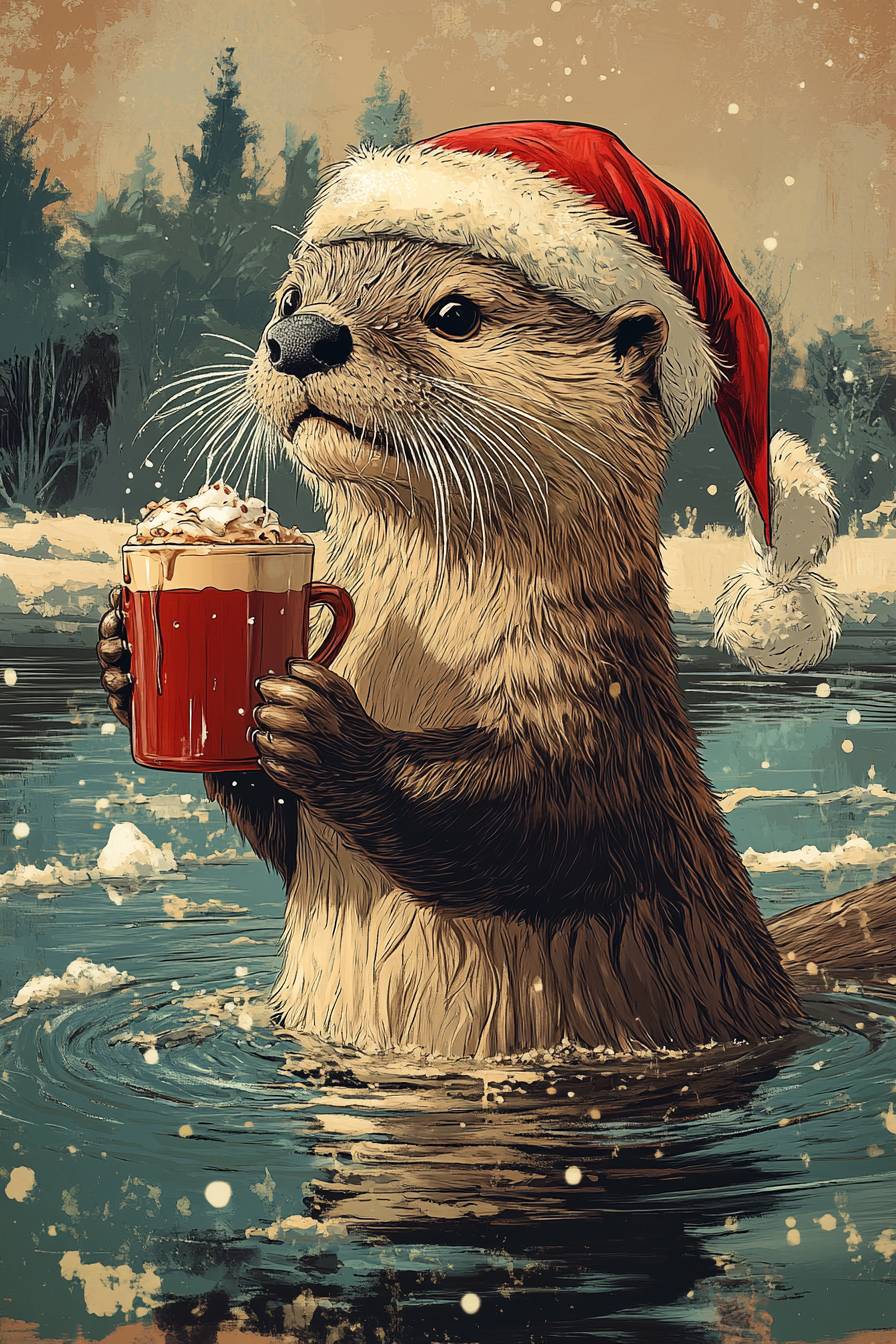 Retro comic book illustration of a water otter wearing a Santa hat floating on the water with hot chocolate in his hands, Christmas mood, nostalgic style --ar 2:3 --stylize 250 --v 6.1