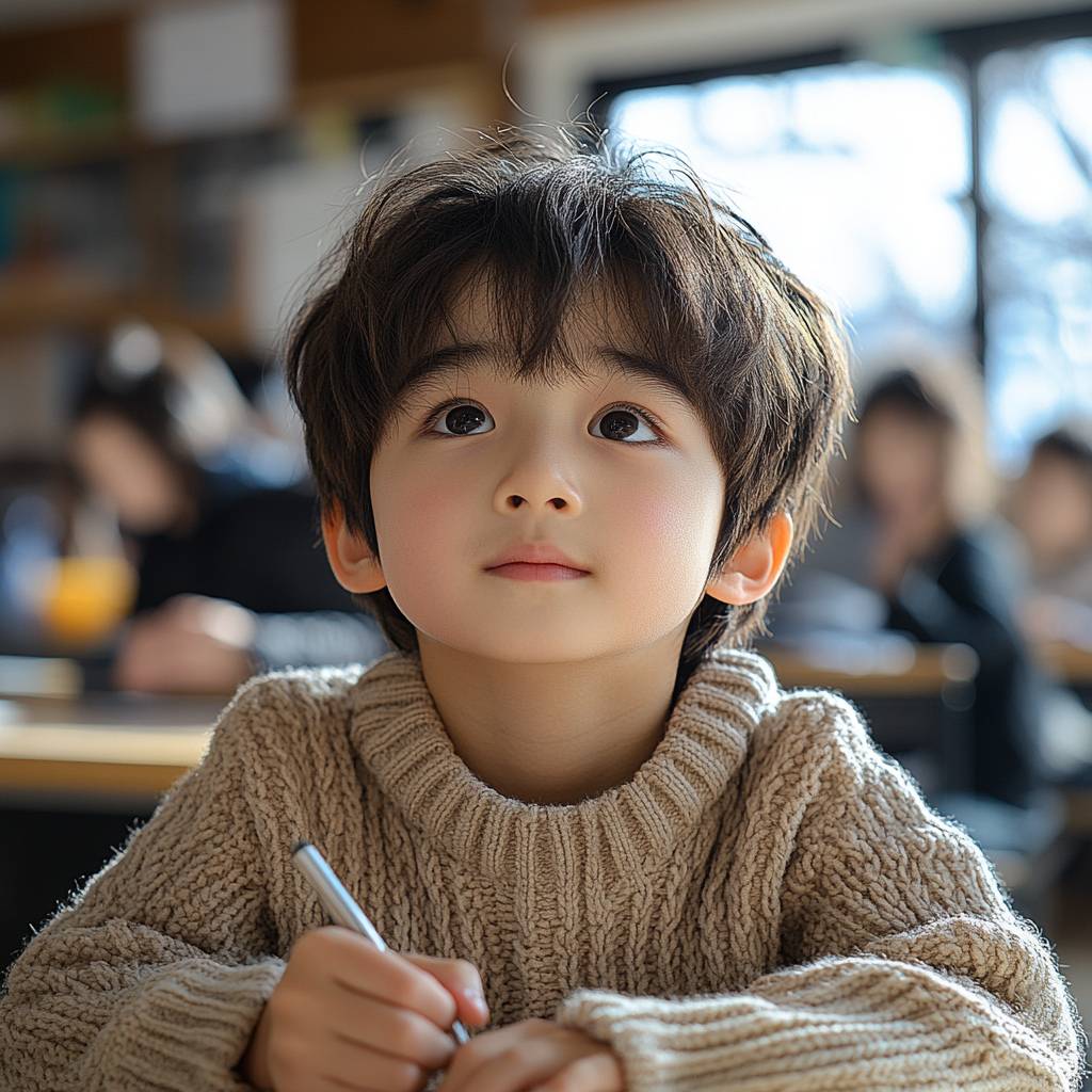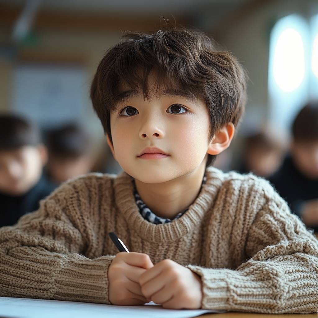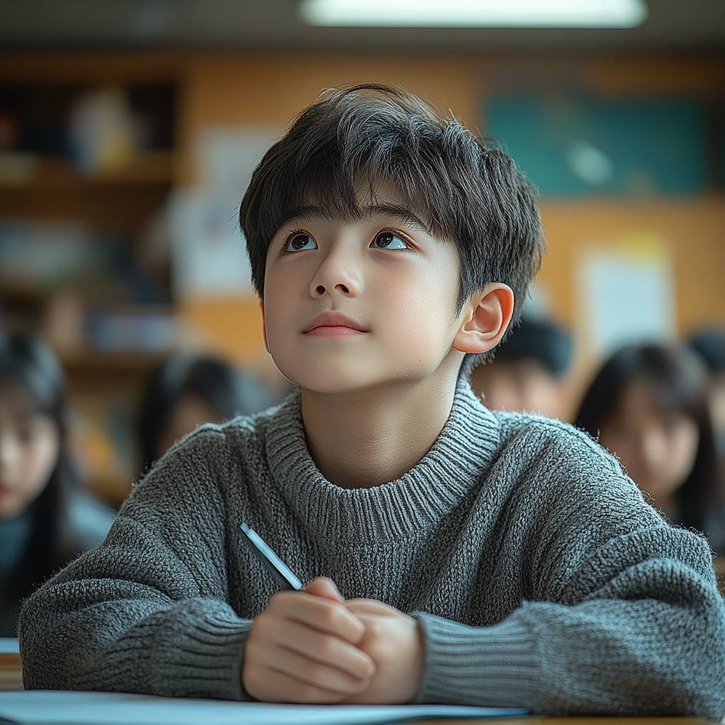 10-летний китайский школьник, мальчик, с тонкими чертами, гладкими волосами, в свитере однотонного цвета, сидящий за столом с ручкой, пишущий домашнее задание, на фоне современного класса, яркий свет, с правого угла, крупный план руки, открывающей тыльную сторону, фокусируясь на руке, четкая рука, реальный снимок, кадр с камеры