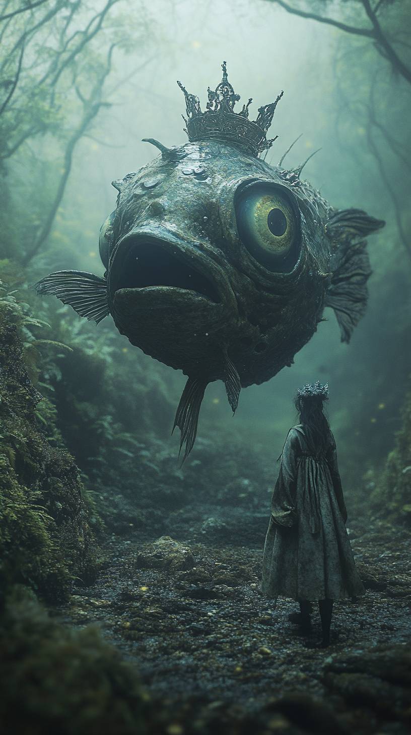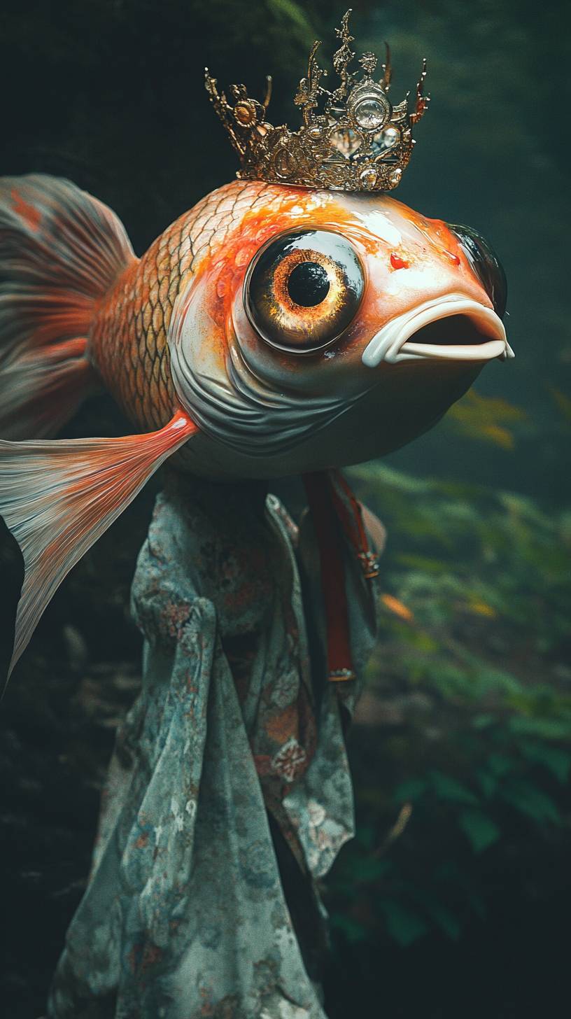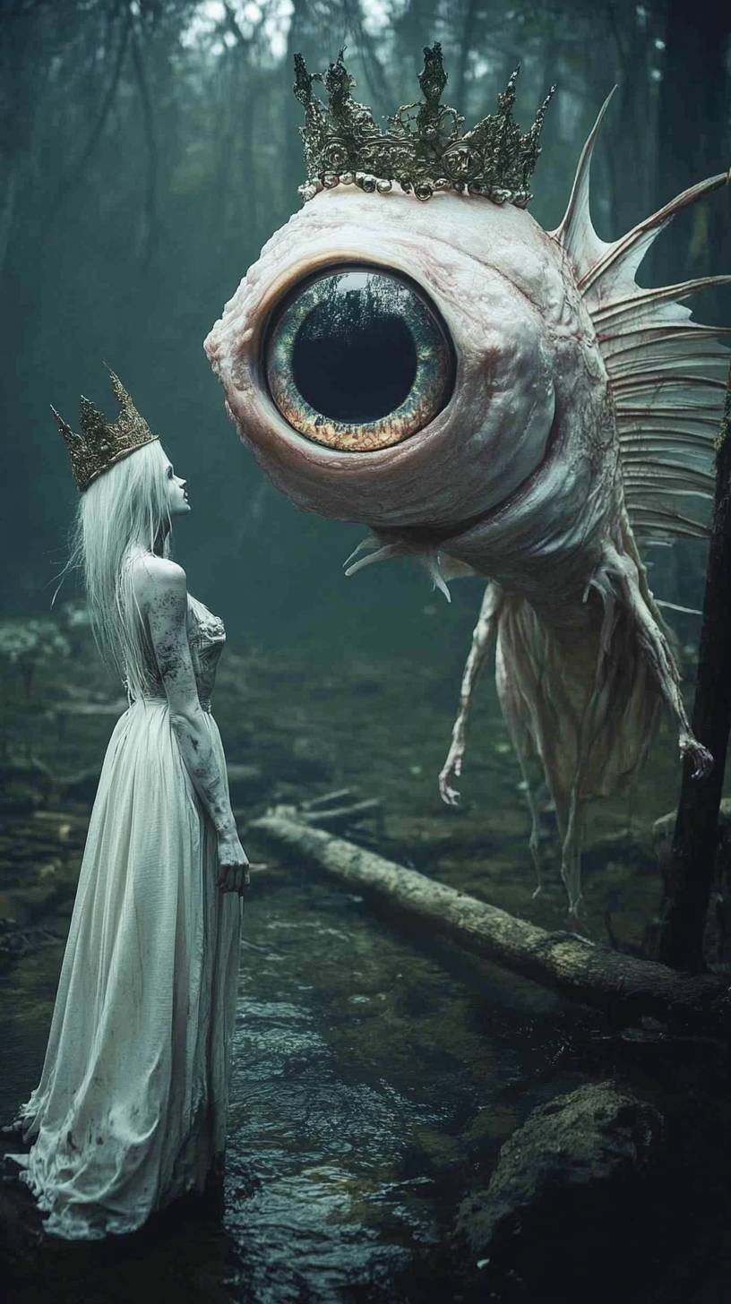 In a creepy dark forest. Two creatures. A photo of an eye with legs and a tail and a crown on its head. It has one ear in the shape of a large fish, which makes its surreal appearance even more appealing. The human body is from the neck down. She is wearing clothes that look like a kimono. This creature looks as if it is living underwater against the eerie background color. Surreal photography style. --ar 9:16 --v 6.1