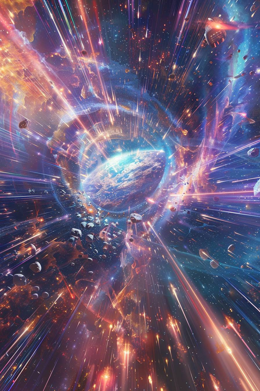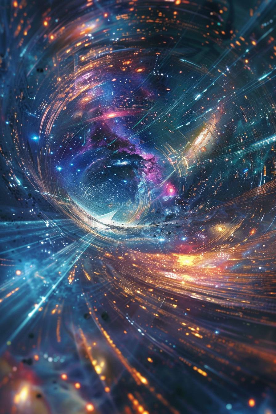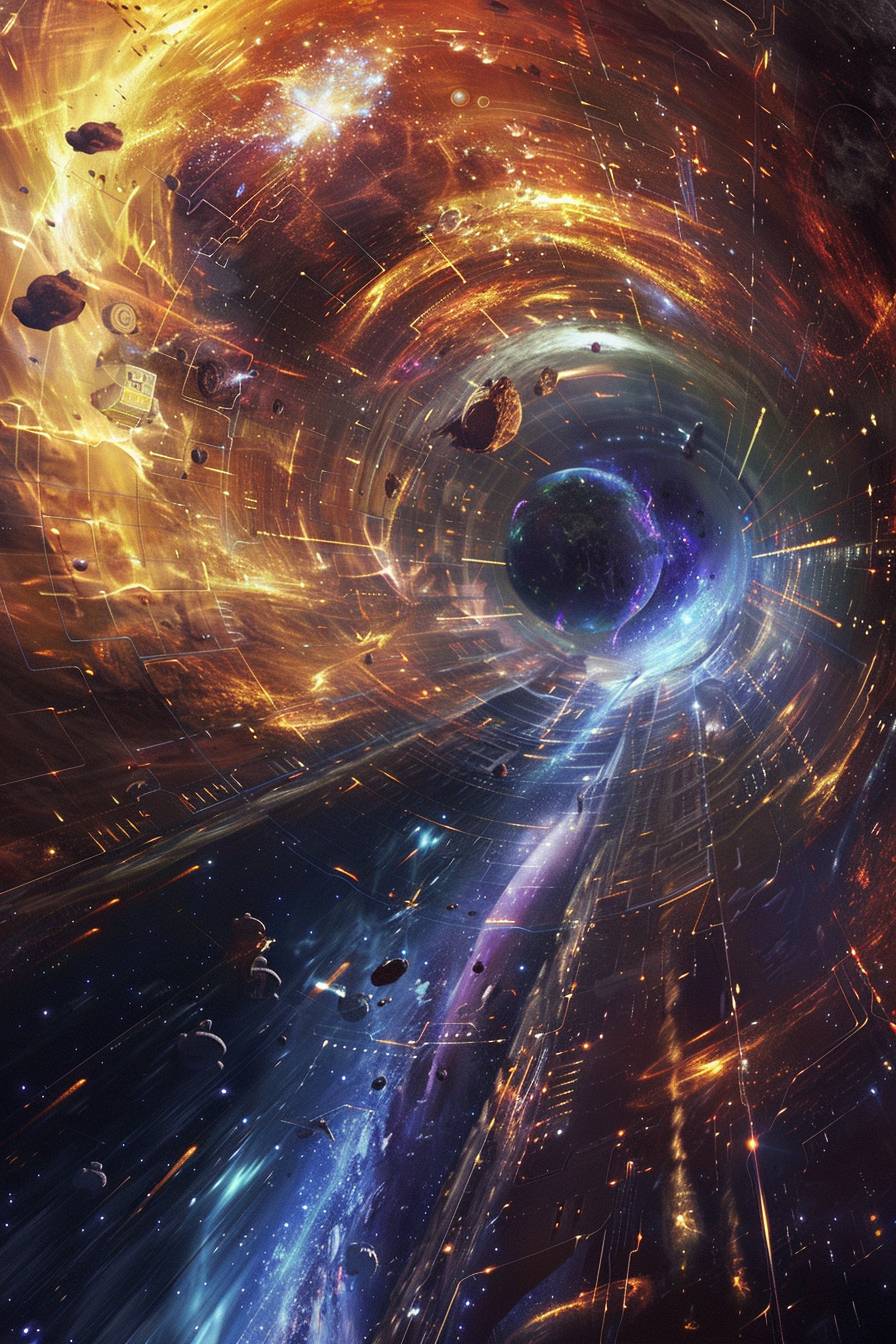 An intergalactic spaceship crewed by a diverse group of humanoid and alien beings, navigating through a cosmic wormhole towards uncharted galaxies, with stars streaking past the windows.-sref 603849217 --ar 2:3 --v 6.0