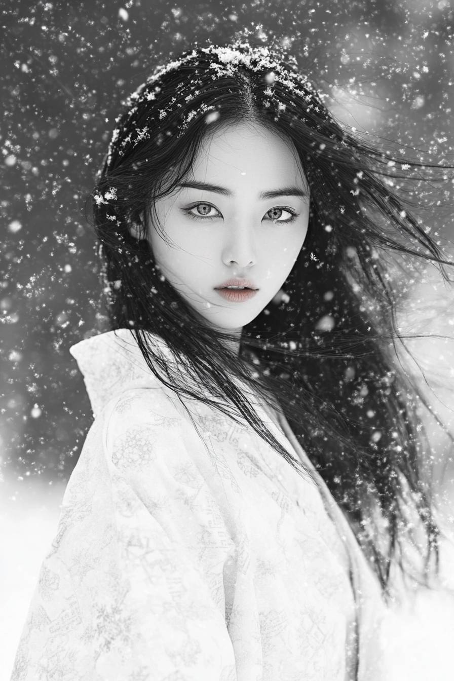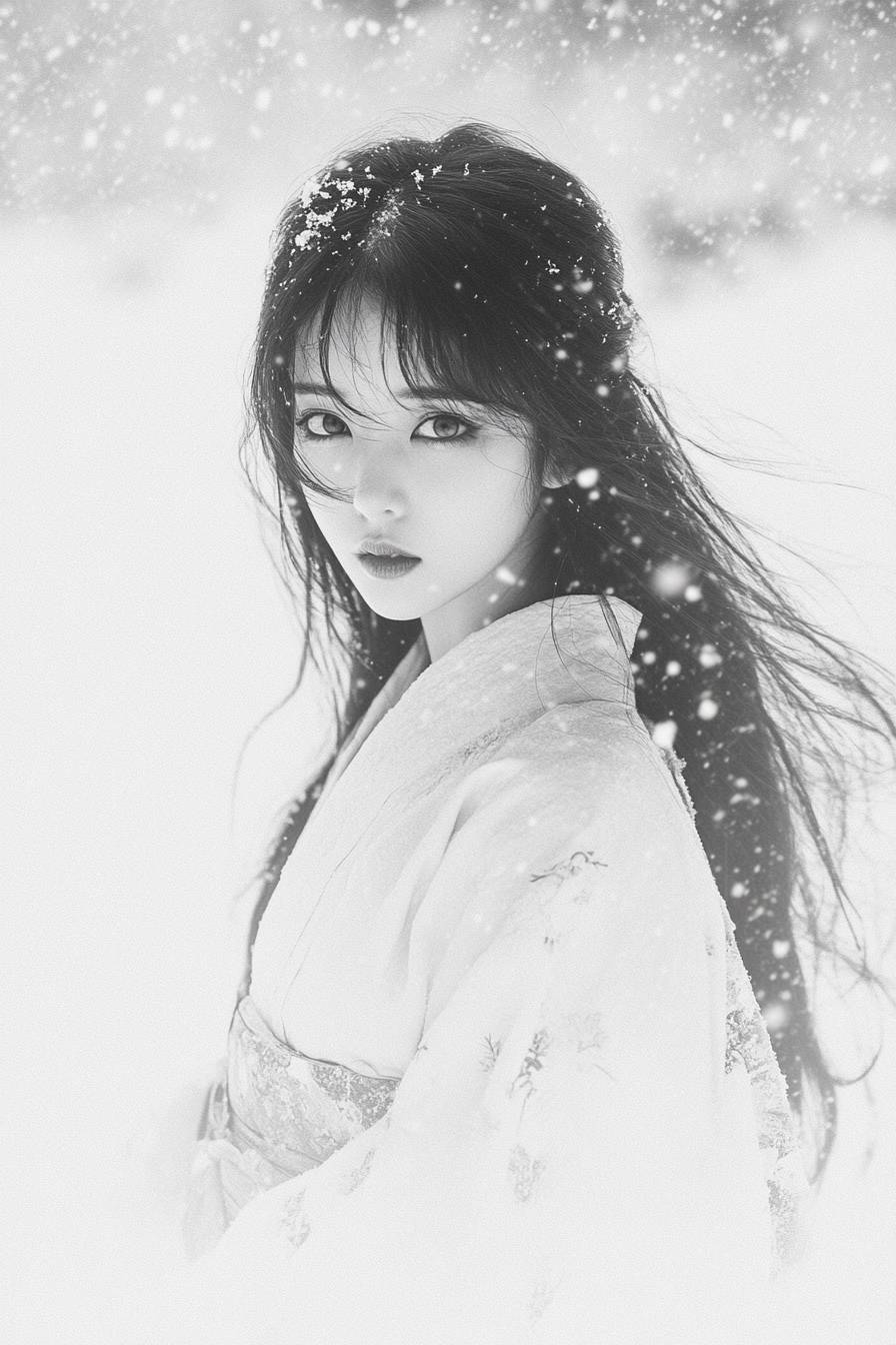 Удивительно красивая японская снежная дух женщина (юки-онна), стоящая в метели, сфотографированная как будто из 1930-х годов, с спокойным, но холодным выражением. Она носит чисто белое кимоно с простыми, элегантными узорами, подходящими для молодой незамужней женщины. Ее волосы длинные, темные и мягко колышутся на ветру. Ее глаза необыкновенного ледяного синего цвета с слегка искаженной зрачком, что придает ей неземной вид. Обстановка - это пустынный снежный горный пейзаж, в реалистичном черно-белом фотостиле, напоминающем фильмы Ака Ирузавы. Сцена должна запечатлеть ее стоящей неподвижно, смотрящей в камеру с интенсивным, но далеким взглядом, как будто она собирается выдохнуть холодное туманных дыхание, которое подует в сторону зрителя. Реалистичный монохромный стиль, высокое качество, высокое разрешение, захватывающее тонкие детали и текстуры в ее одежде, волосах и закручивающемся снегу.