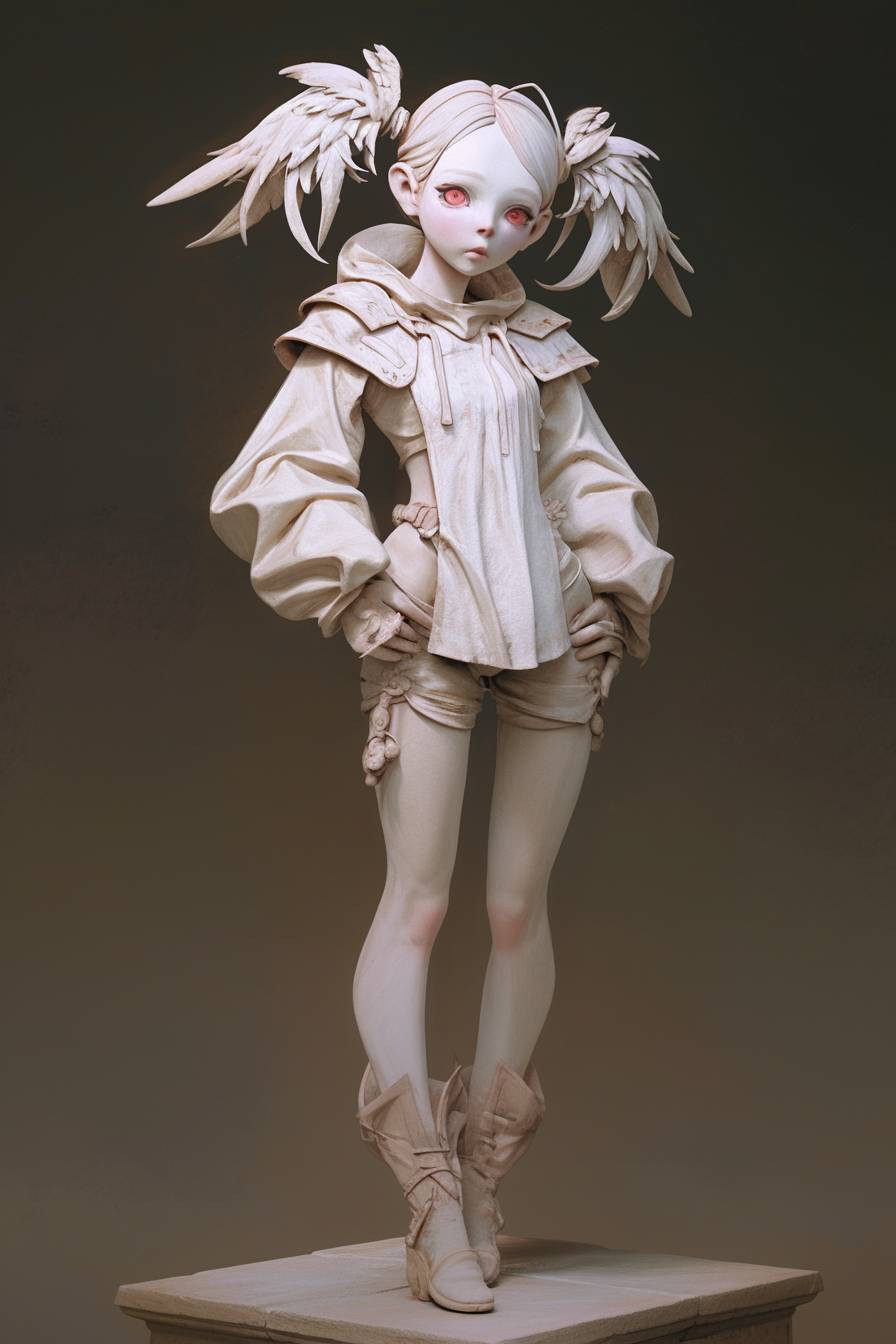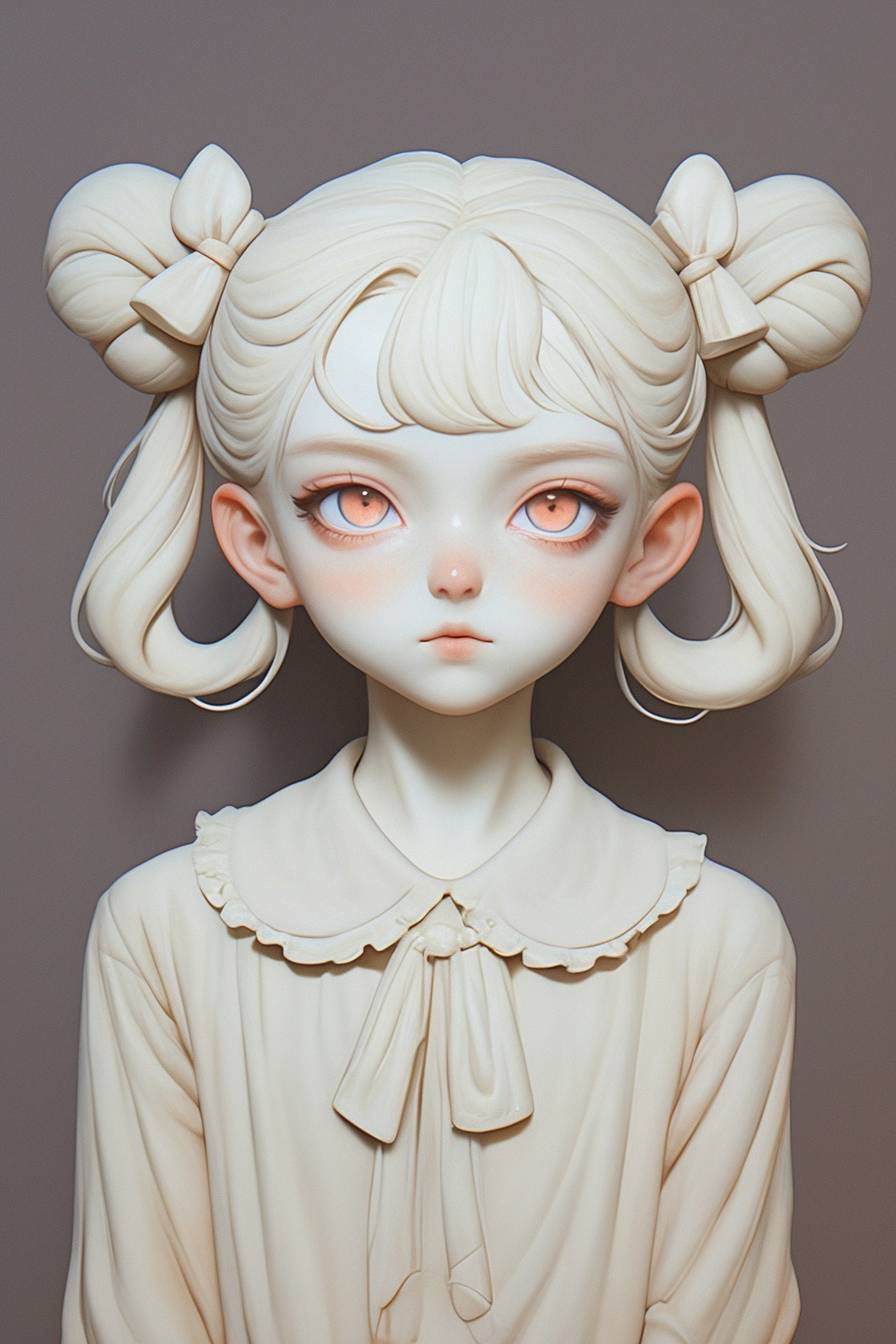 Полноразмерный портрет девушки с двумя белыми хвостиками и красными зрачками, в элегантной стоячей позе.