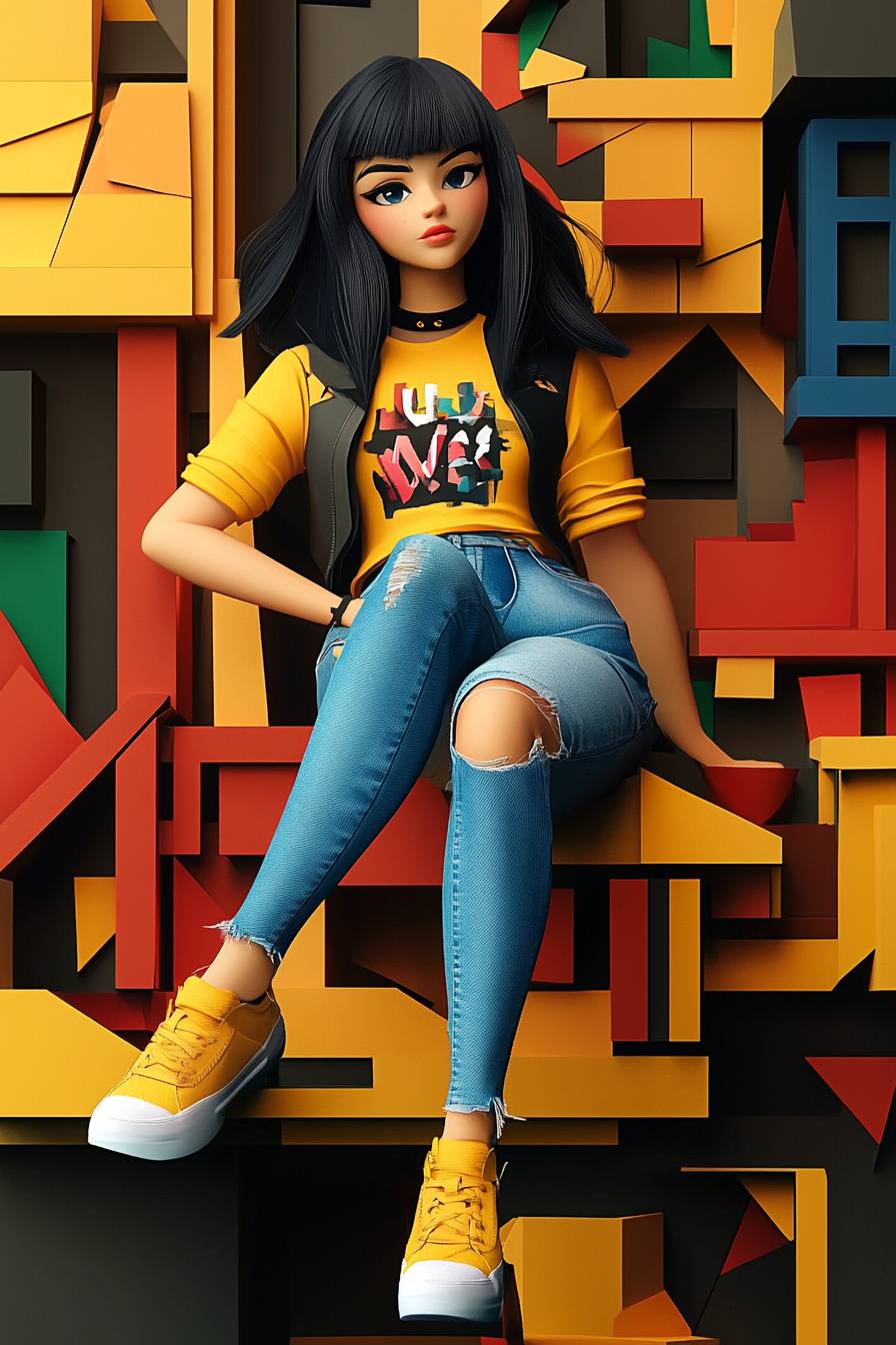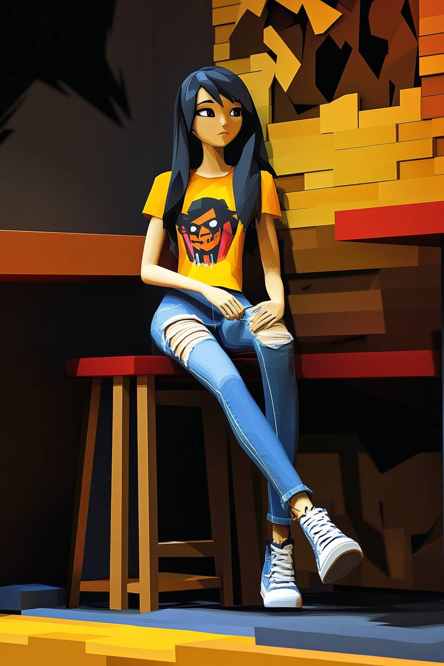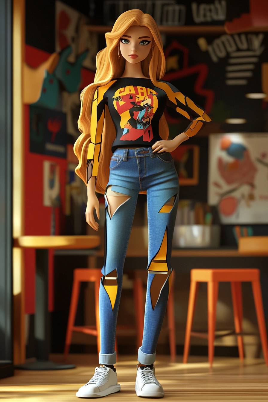 Персонаж аниме-женщина в повседневных джинсах, рваных джинсах, футболке с графикой и кроссовках в неформальной обстановке кафе.
