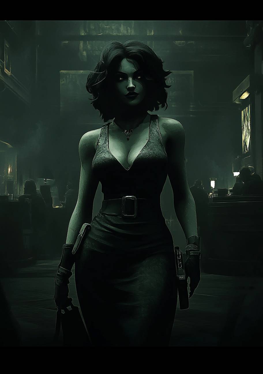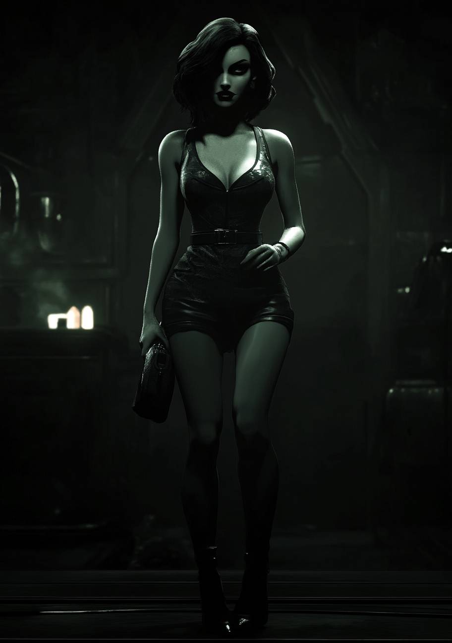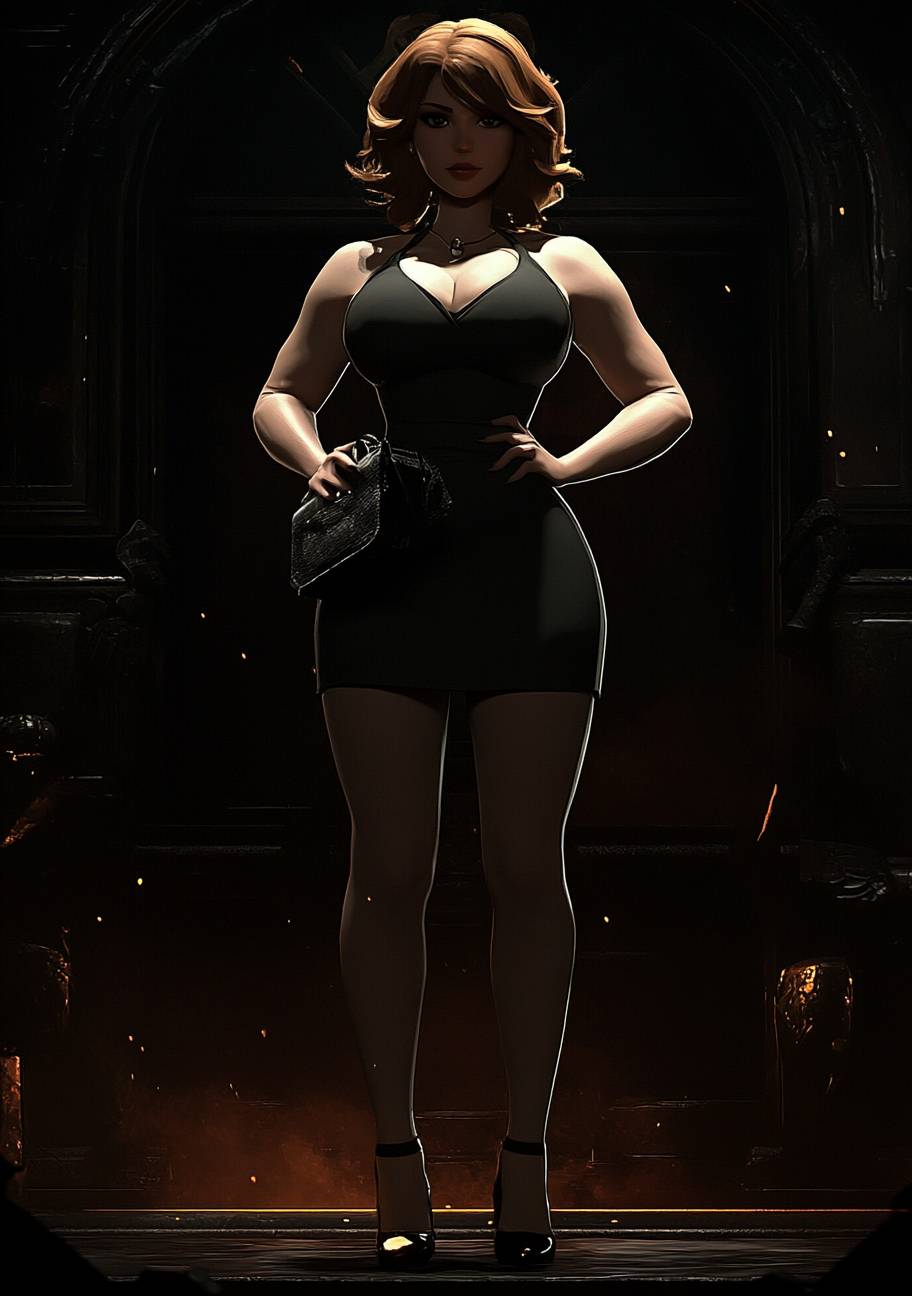 Персонаж женщины аниме, утонченный вечерний выход, коктейльное платье и высокие каблуки в плохо освещенном клубе.