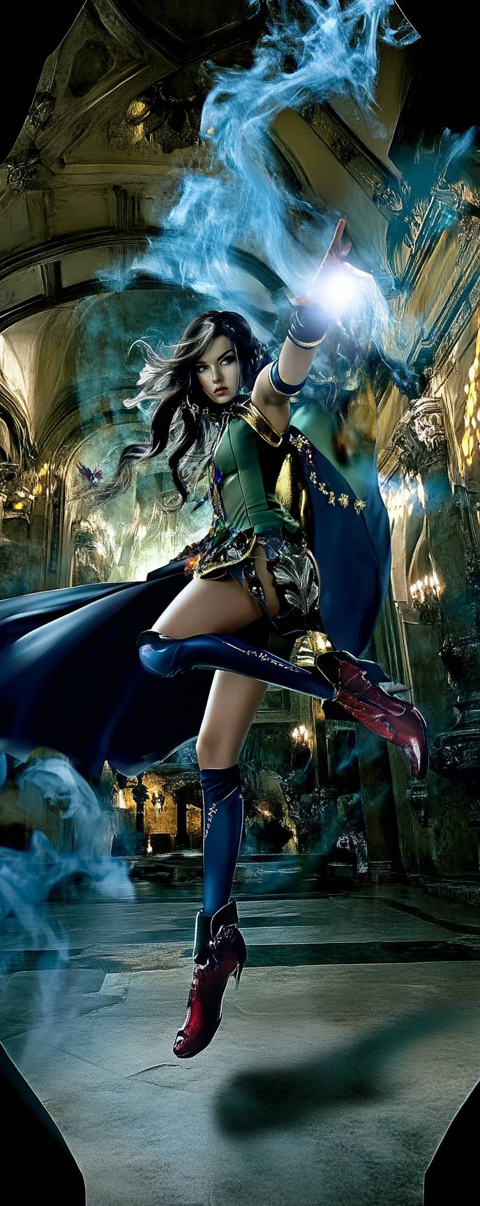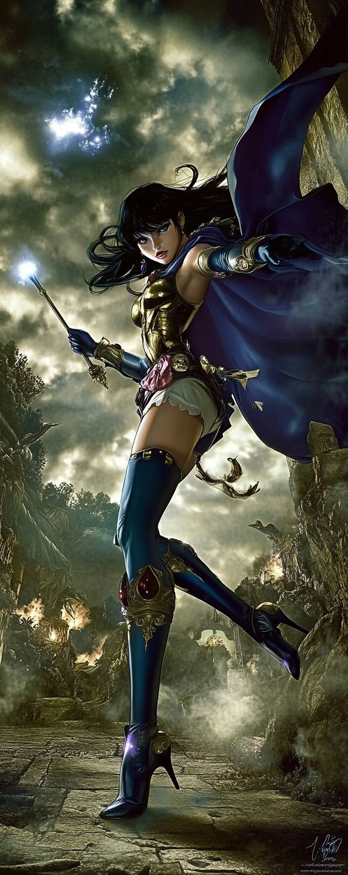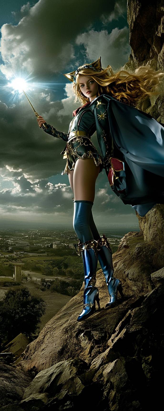 Персонаж магической девушки в блестящих ботинках, с плащом, волшебной палочкой и ярким мистическим фоном.