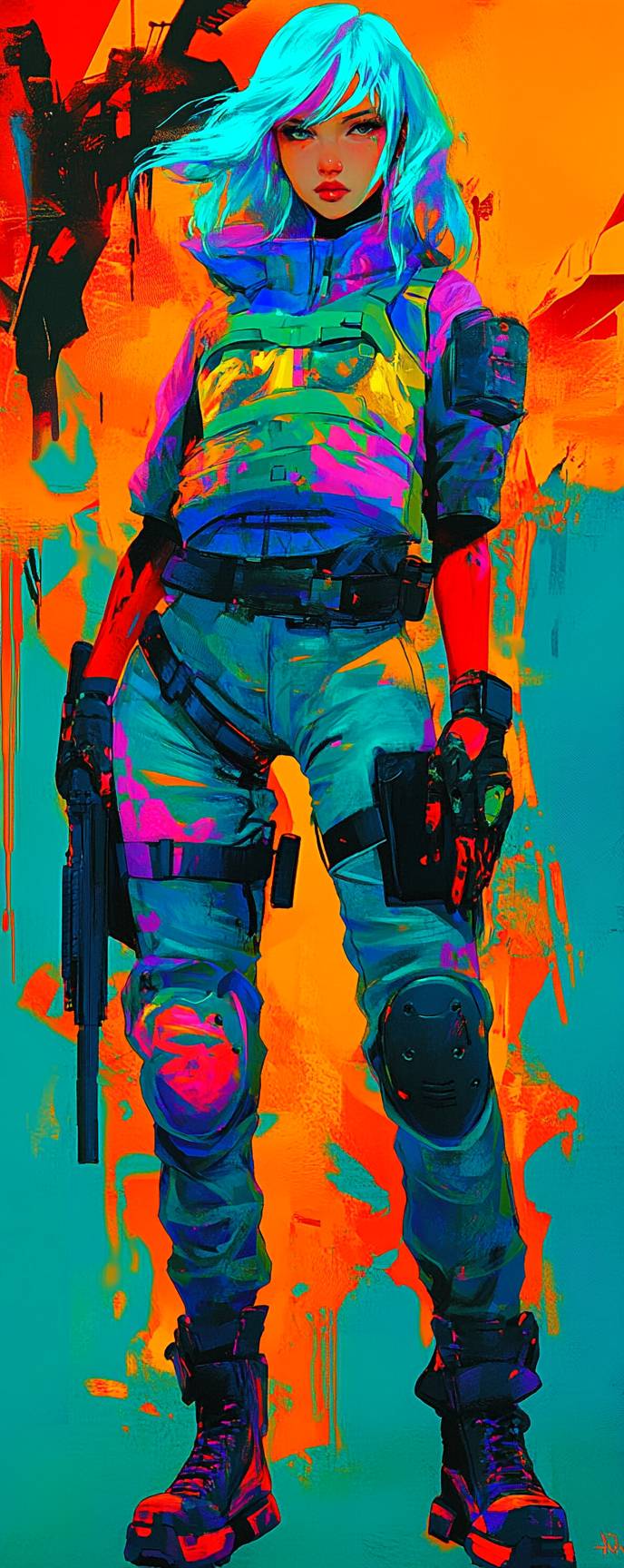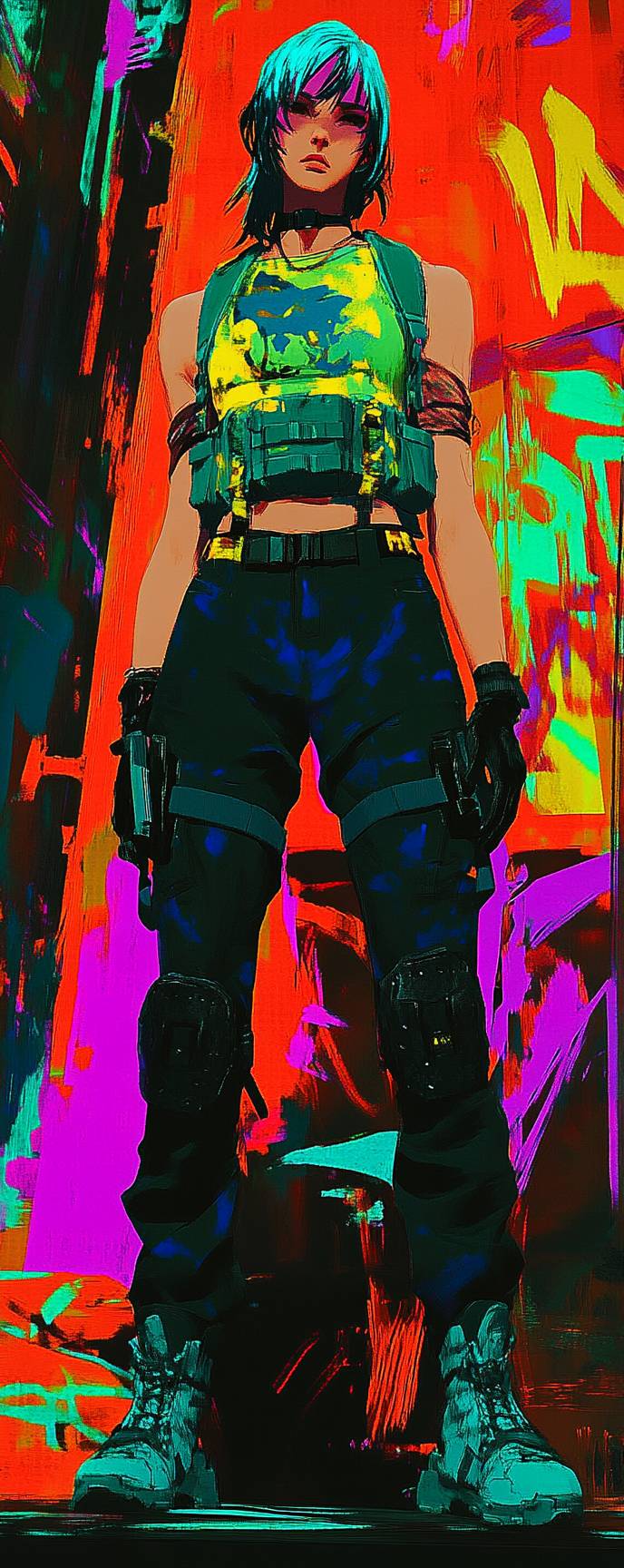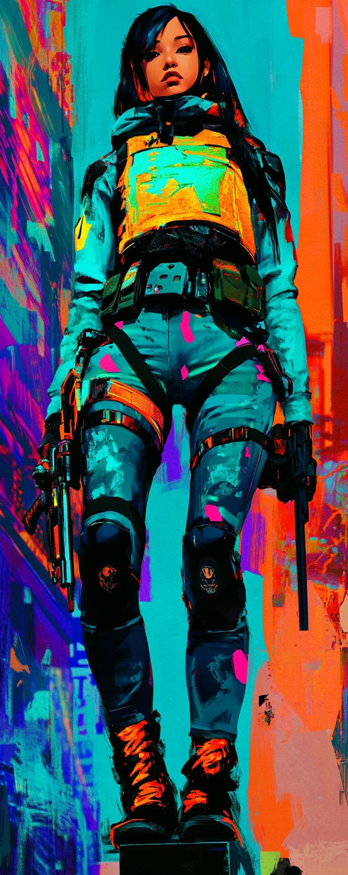 Аниме женский персонаж, городской воин, в бронированном жилете, боевых штанах и тактических ботинках на городском поле боя.
