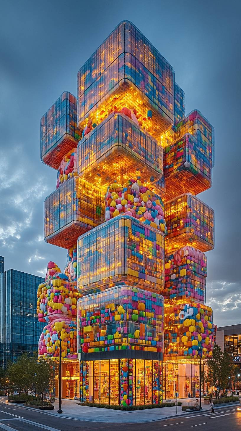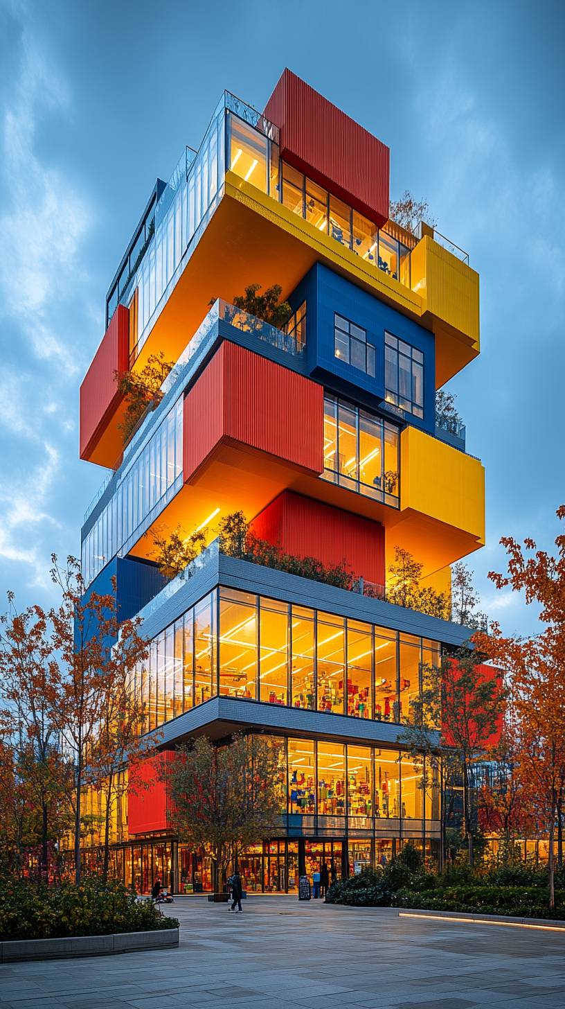 Масса здания создается за счет укладки oversized Lego блоков, где каждый уровень четко взаимосвязан и вносит свой вклад в общую форму.