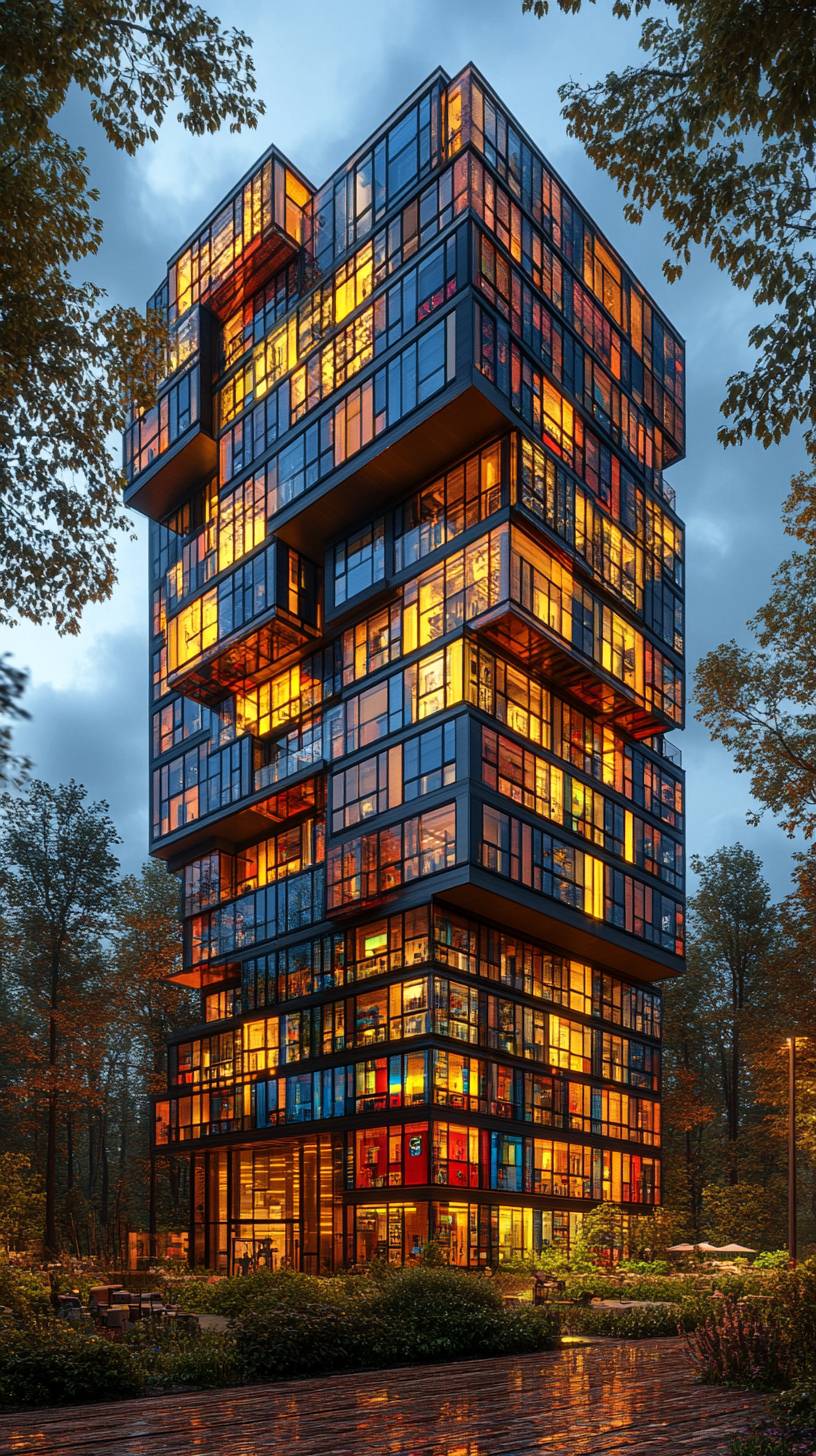 The building's massing is created by the stacking of oversized Lego blocks, with each layer clearly interlocking and contributing to the overall form. --chaos 10 --ar 9:16 --style raw --stylize 600 --v 6.1