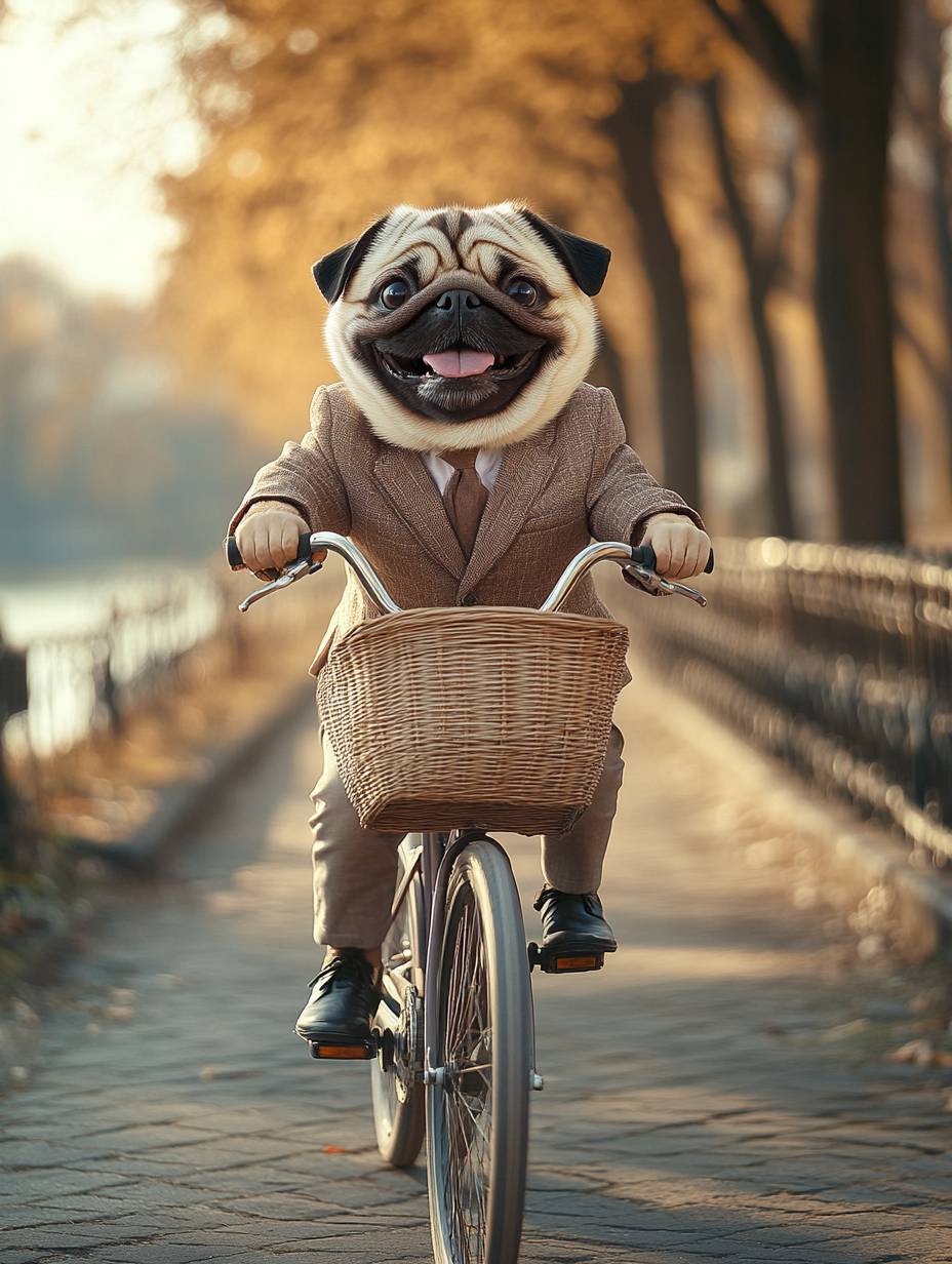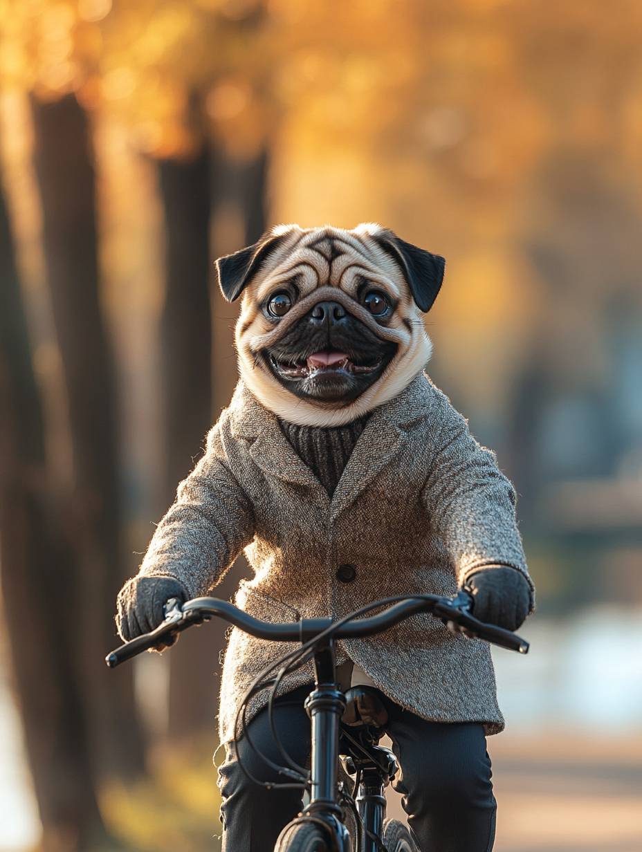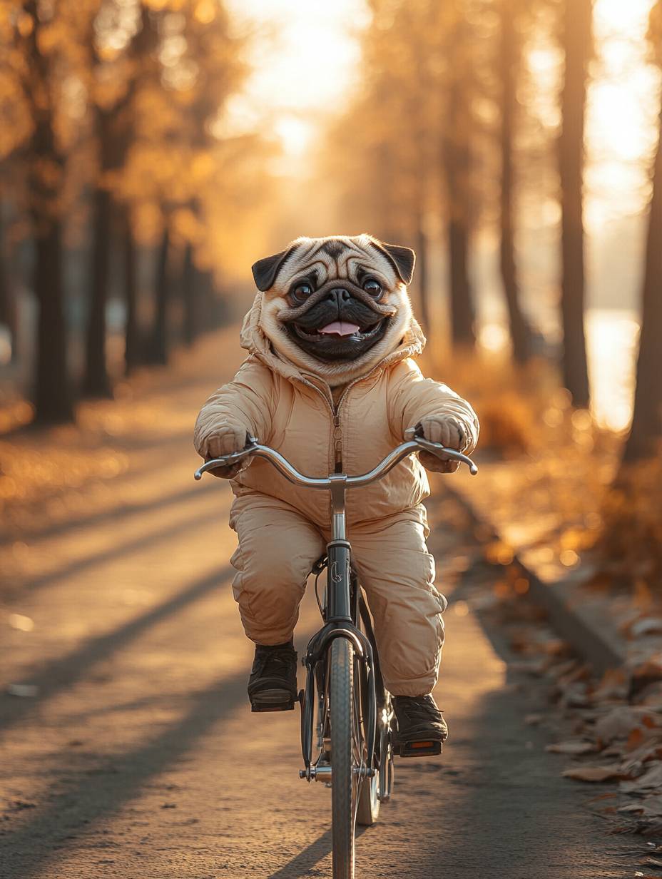 This is a professional photograph of a anthropomorphic full body portrait of an animal. A cute pug dog, dressed in sports suit, with big smile, is riding a bicycle by the lake. The background is a spacious sidewalk by the lake, with a row of trees along the lake and a sidewalk on the ground. Bright sunshine, reflection, warm atmosphere. Fujifilm camera shooting, fine image detail processing, high-definition photography, magazine photography style. --ar 3:4 --stylize 250 --v 6.1