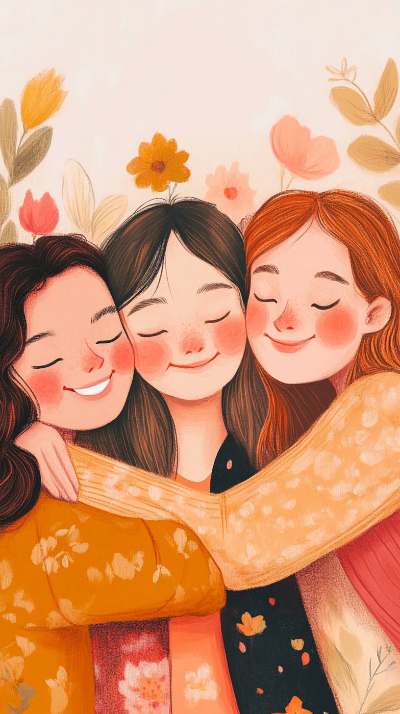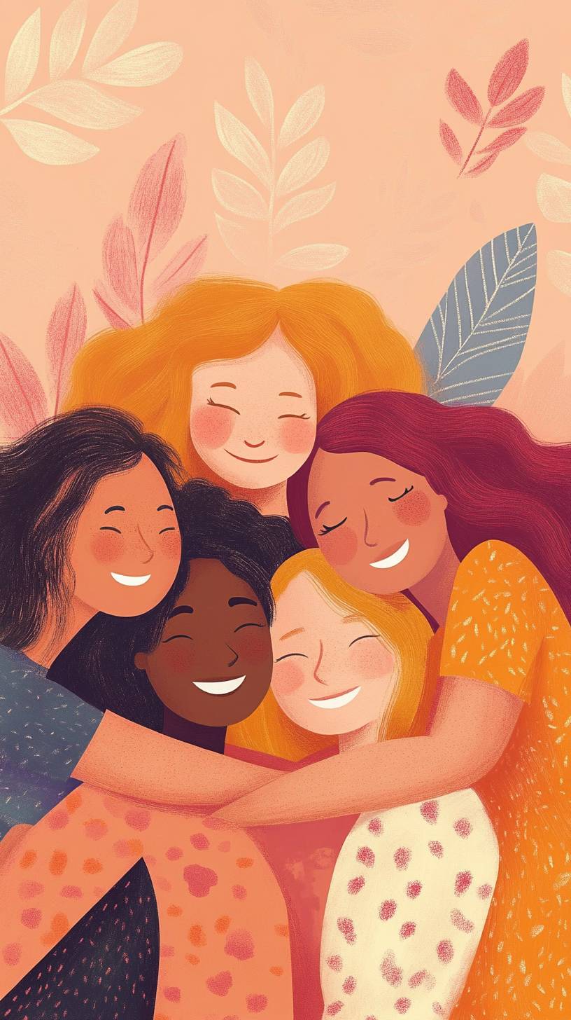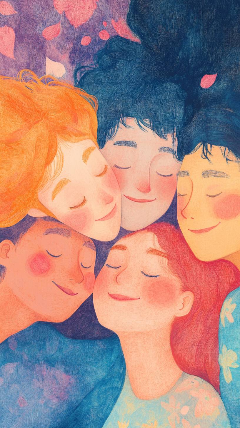 A Soft Pastel Illustration of a group of friends embracing and smiling together, bright colours, calming, pleasing aesthetic --ar 9:16 --v 6.1