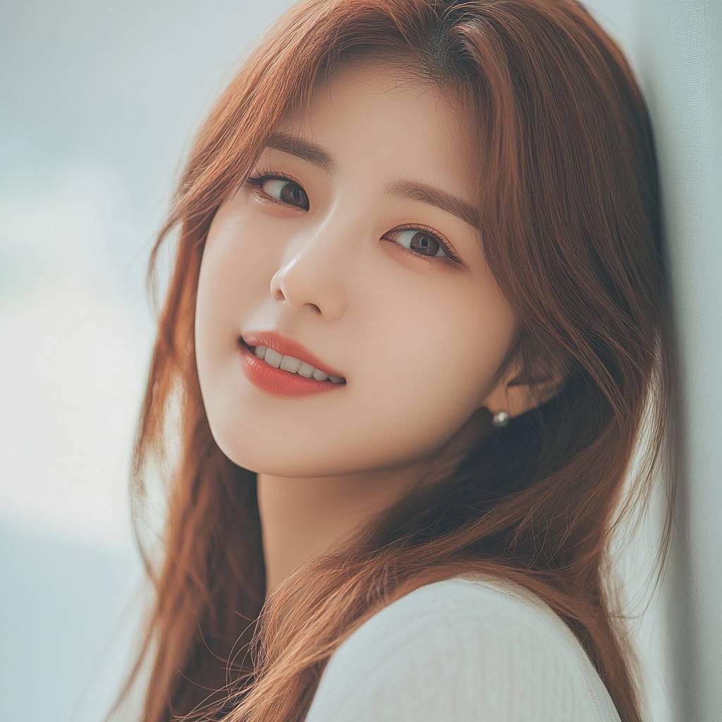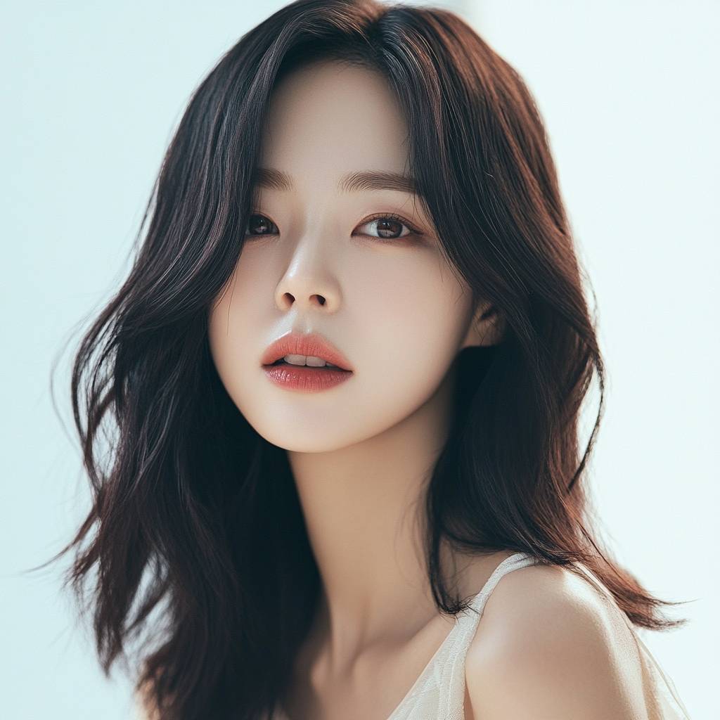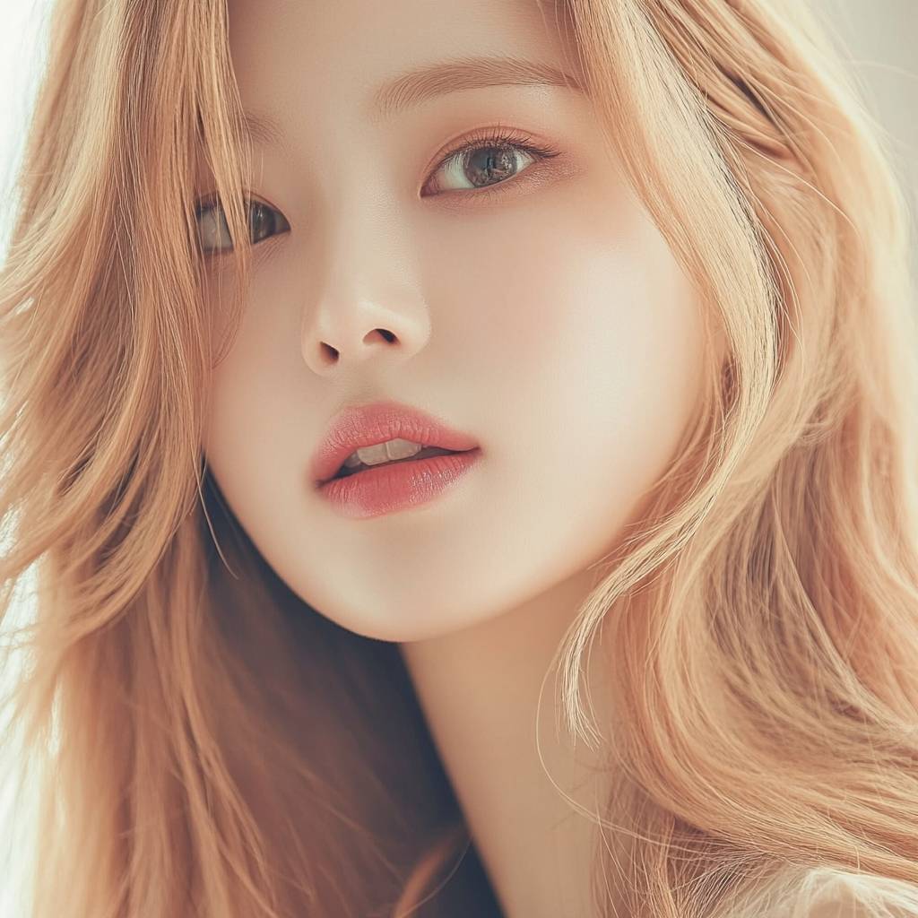 hallyu, A photograph of a Korean woman with feminine beauty, smooth skin; a delicate, pretty face; plump lips; subtle makeup; and fair hair color. with shoulder length hair style and straight. She looking at the camera and smiling slightly. The overall effect is clean and elegant, with the focus entirely on her face, creating a stunning visual impact. simple and light color background. Professional photography, high resolution. --style raw --stylize 50 --v 6.1