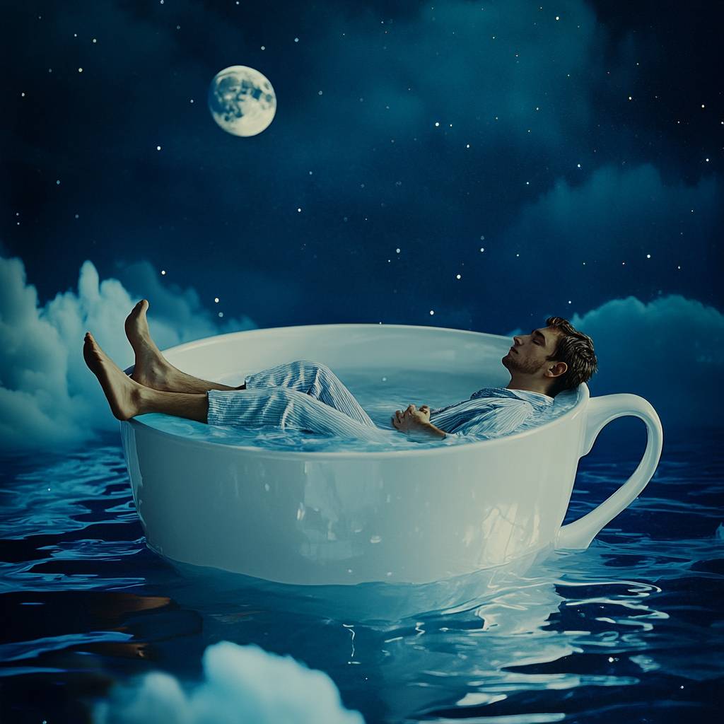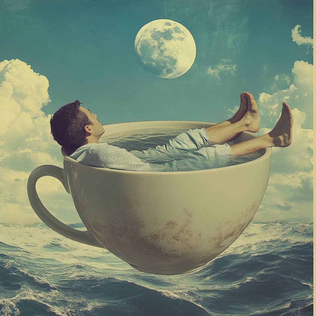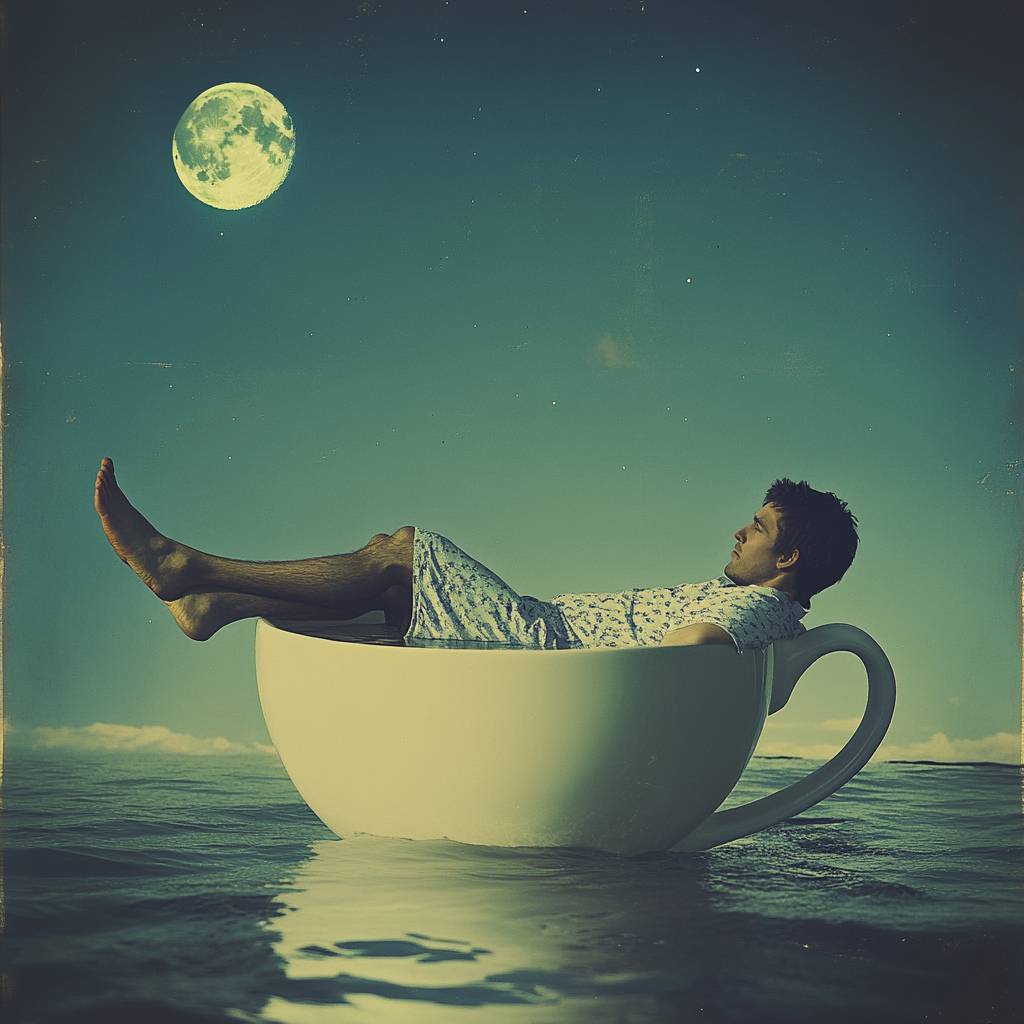 Комическая композиционная фотография мужчины, лежащего в большой чашке кофе, похожей на бассейн, и смотрящего на луну в небе. Мужчина обнял края чашки, одет в пижаму, реалистичная фотография, детальная фотография, 50 мм объектив, пленка Kodak, винтаж.
