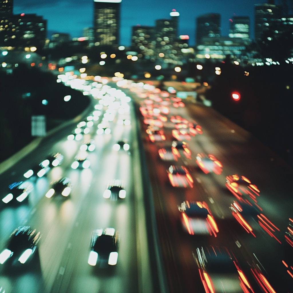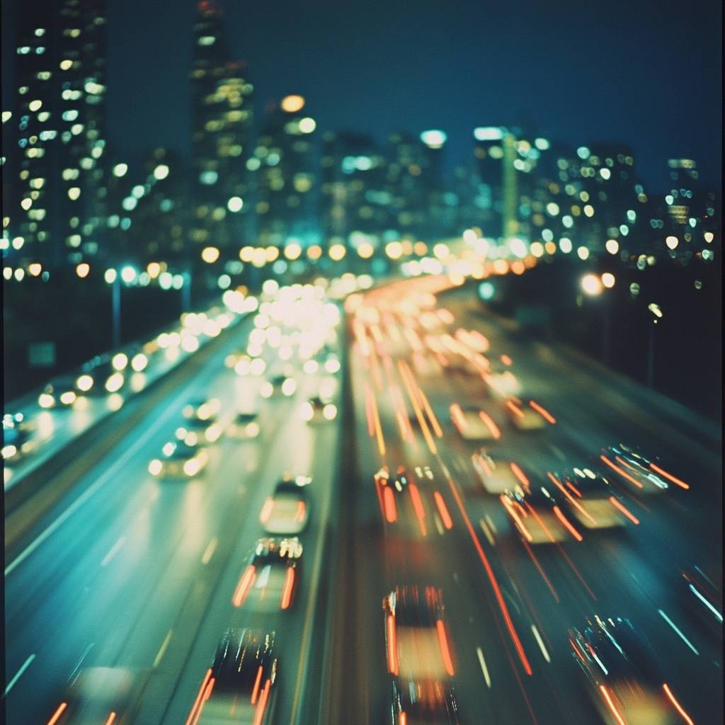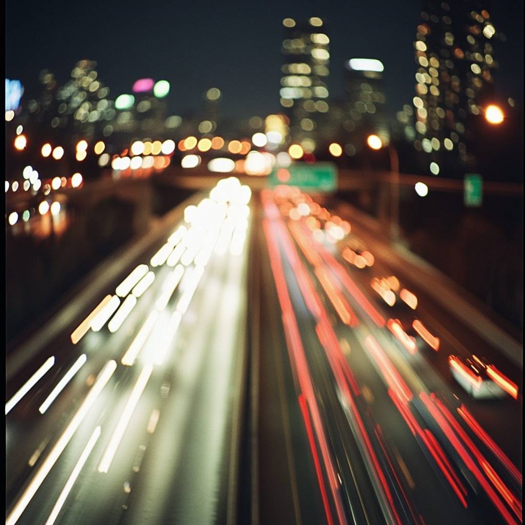 View looking down over city bridge at fast cars on freeway at night, blurred, car lights bokeh, Kodak photograph --style raw --v 6.1