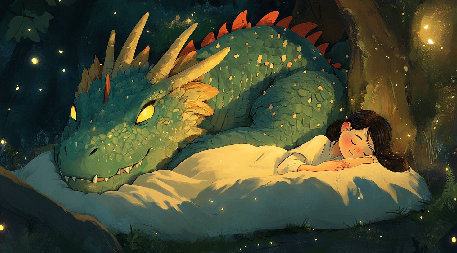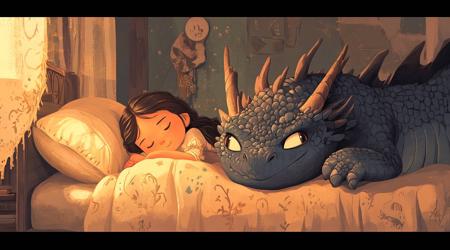 A cute dragon lies next to the sleeping girl, in a cartoon style, with a flat design, a fantasy illustration, an epic composition, beautiful lighting, highly detailed, with a smooth and sharp focus, in the style of Atey Ghailan, Jon Klassen, Jacek Yerka, and Greg Rutkowski. --ar 128:71 --v 6.1