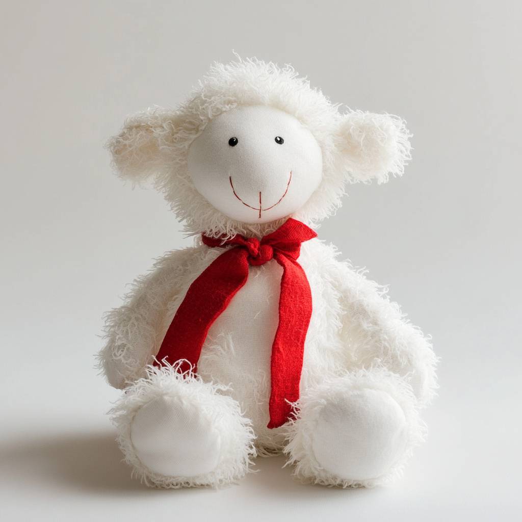 Создайте супер мягкую и удобную игрушку для младенцев, которая будет белой и пушистой с яркими красными акцентами в пустой белой студии.