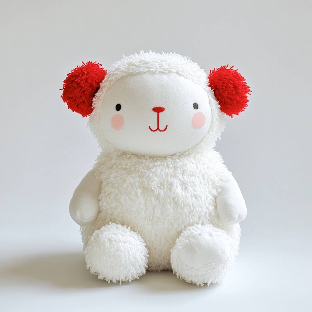 Создайте супер мягкую, удобную игрушку для ребенка, белую и пушистую с яркими красными акцентами в пустой белой студии.