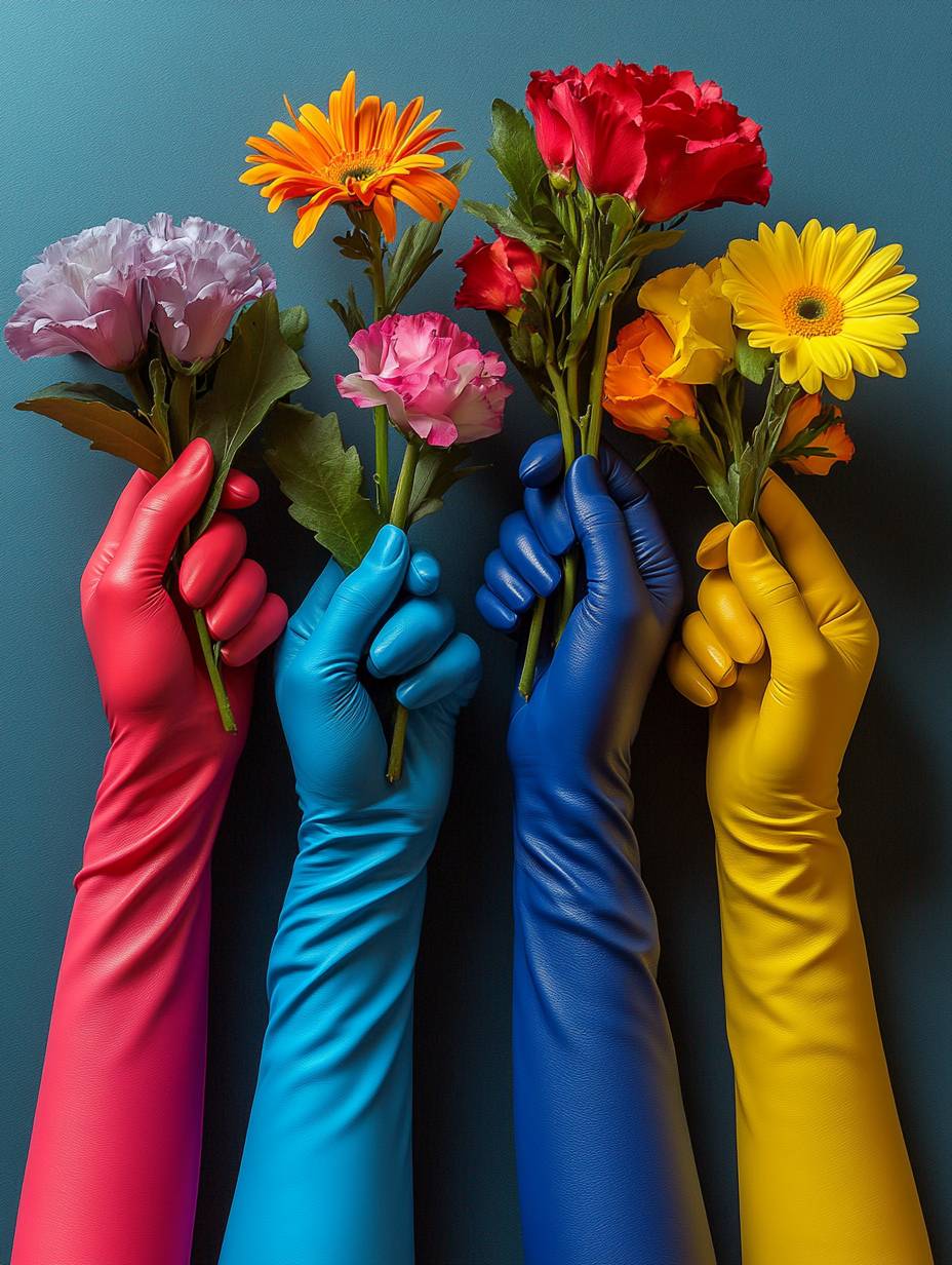 Пять-семь рук в разноцветных перчатках, каждая рука в разной позе, держащая цветы. Перчатки не слишком женственные, яркие, но фон однотонный.