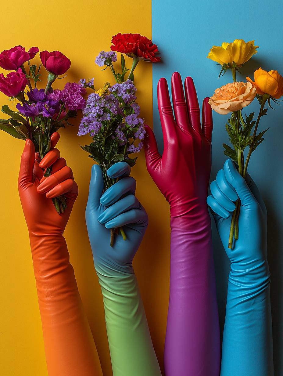Пять-семь рук в цветных перчатках, каждая в разных позах и держит цветы, перчатки яркие, но не слишком женственные на однотонном фоне.