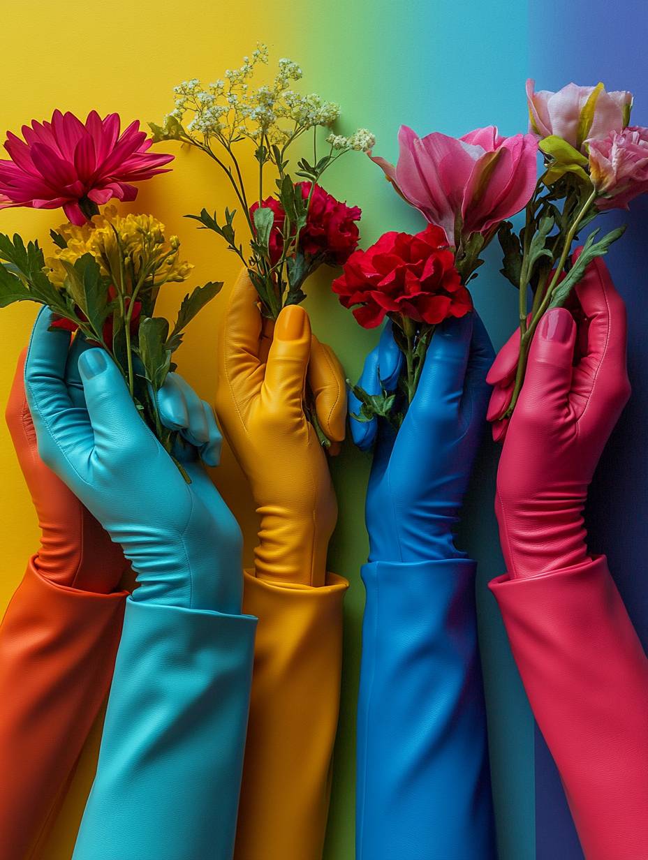 five to seven hands that are wearing colorful gloves, each hands are different posing and holding flowers, gloves are not too feminine, colorful but solid colored background --no lace detail --ar 3:4 --stylize 1000 --v 6.1