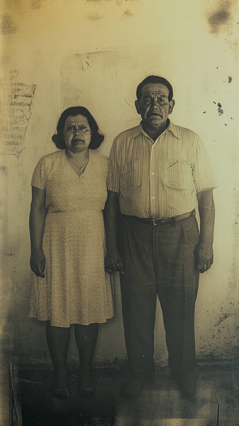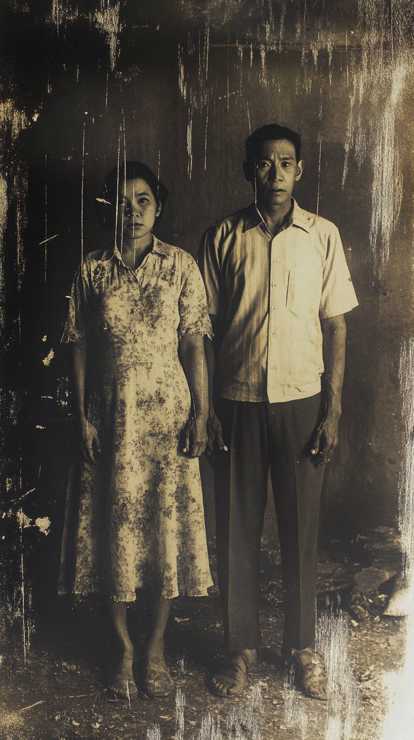This is an old photo taken in the 1970s. A fat couple stands side by side. They look ugly and ferocious, with greedy eyes, surrounded by flickering shadows. They are grainy and of poor quality. Like it was captured on an old VHS camcorder. Mock movie, eerie, found footage style, horror atmosphere, --ar 9:16 --v 6.1