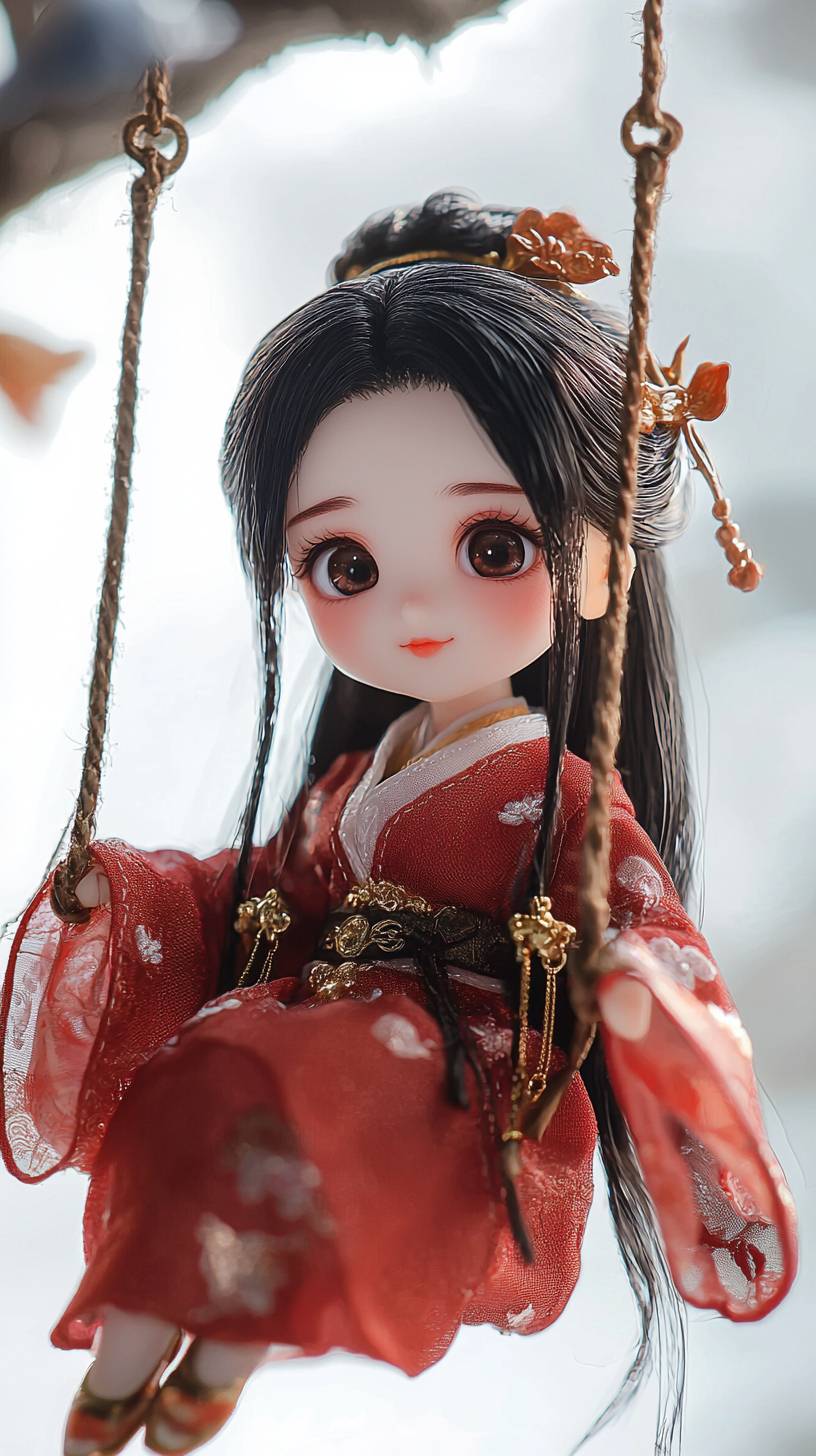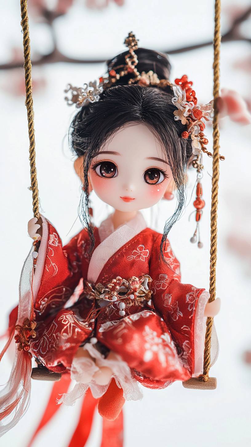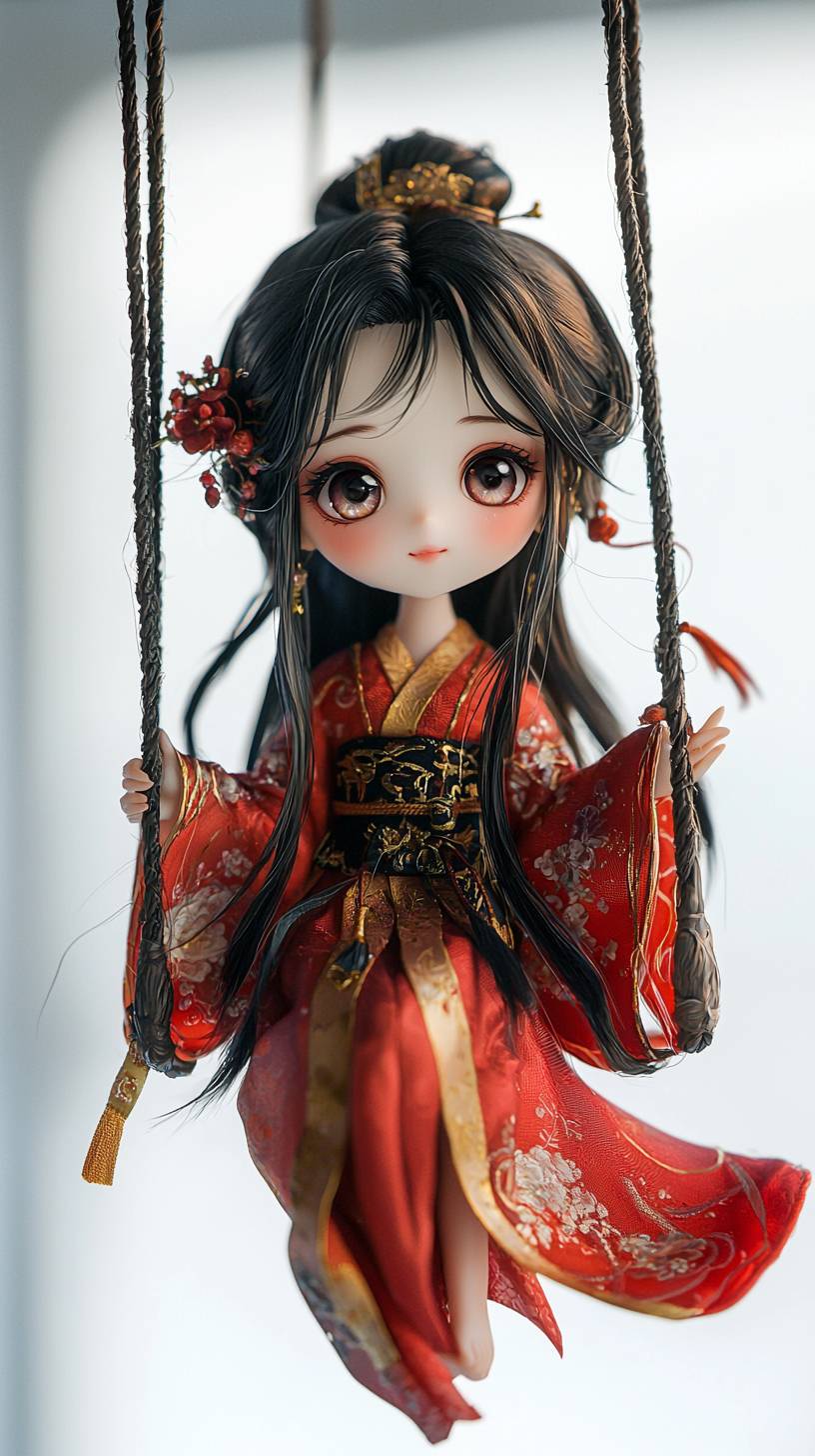 На верхней части изображения находится палец с привязанной к нему качелечкой, а миленькая китайская фея раскачивается на ней. У неё красивые большие глаза, очаровательная улыбка и длинные черные волосы, она одета в свободное красное ханфу на белом фоне с студийным освещением.