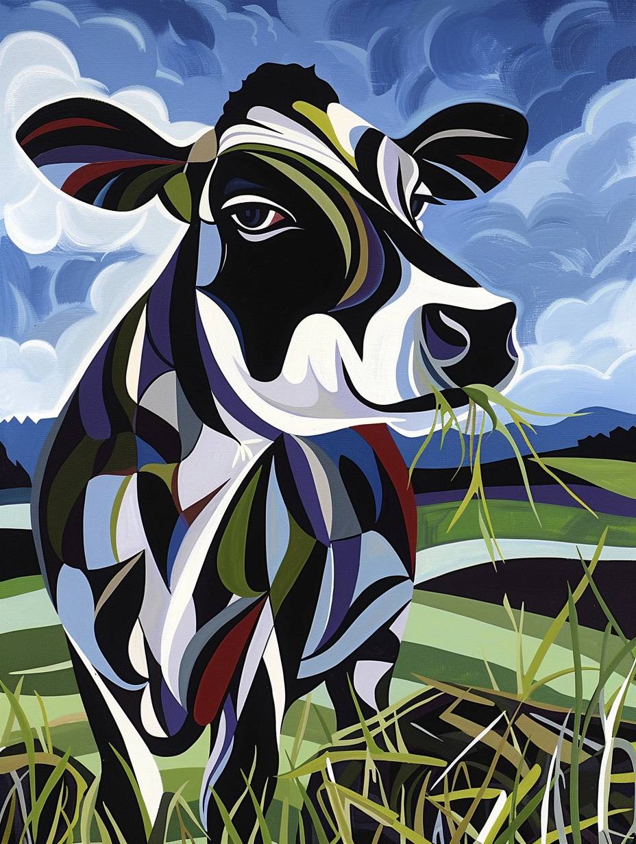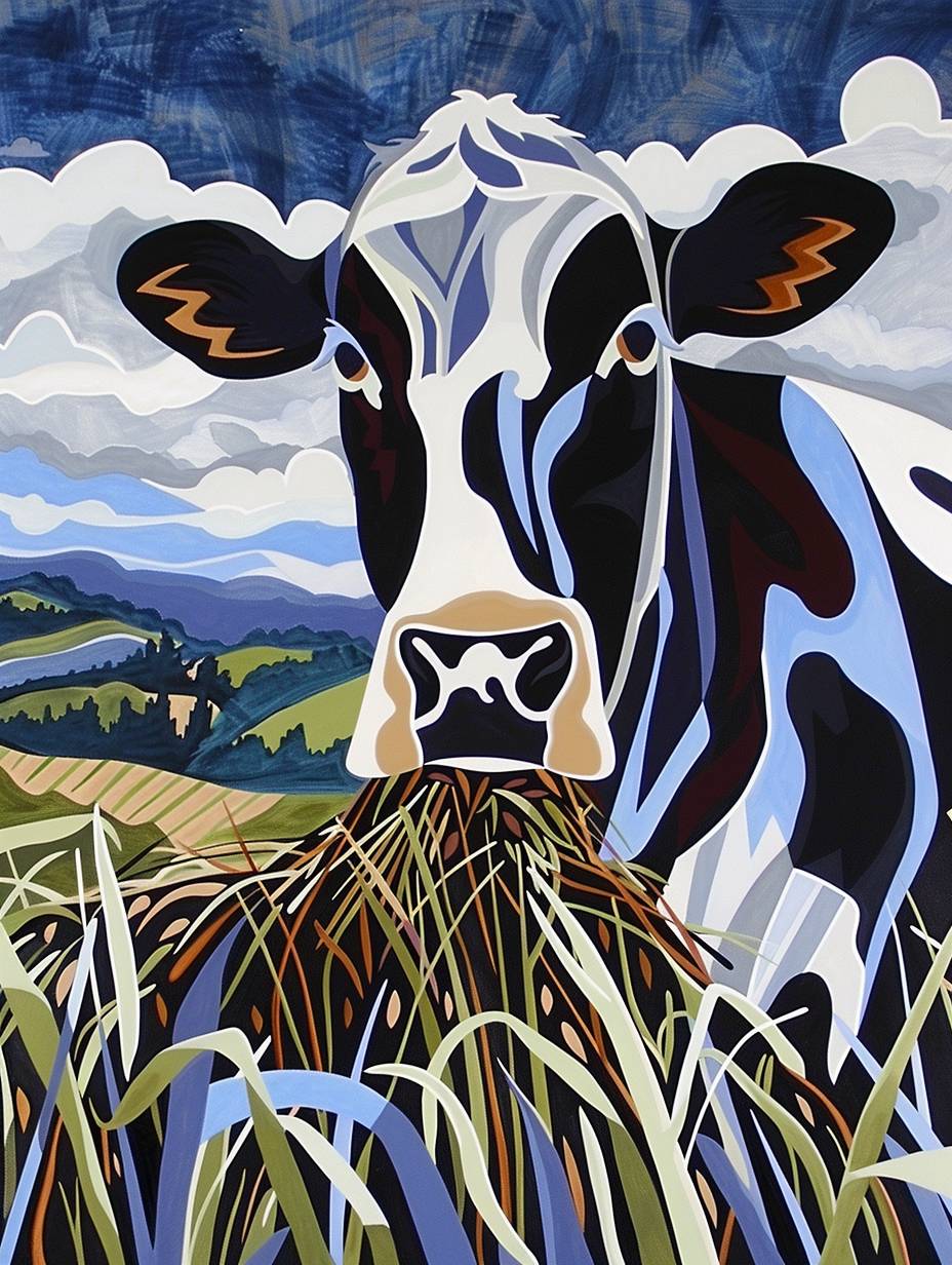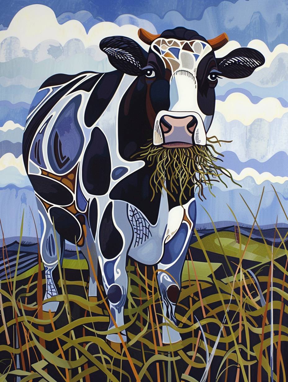 Веселая корова стоит на зелёном пастбище и жует связку сена. Сцена разворачивается на фоне яркого голубого неба с пушистыми белыми облаками. У коровы игривое выражение лица, с широкой улыбкой и яркими, выразительными глазами. Стиль напоминает культовые мультфильмы Ала Каппа с преувеличенными чертами и живой энергией. Цвета яркие и насыщенные, добавляя сказочный оттенок к сцене.