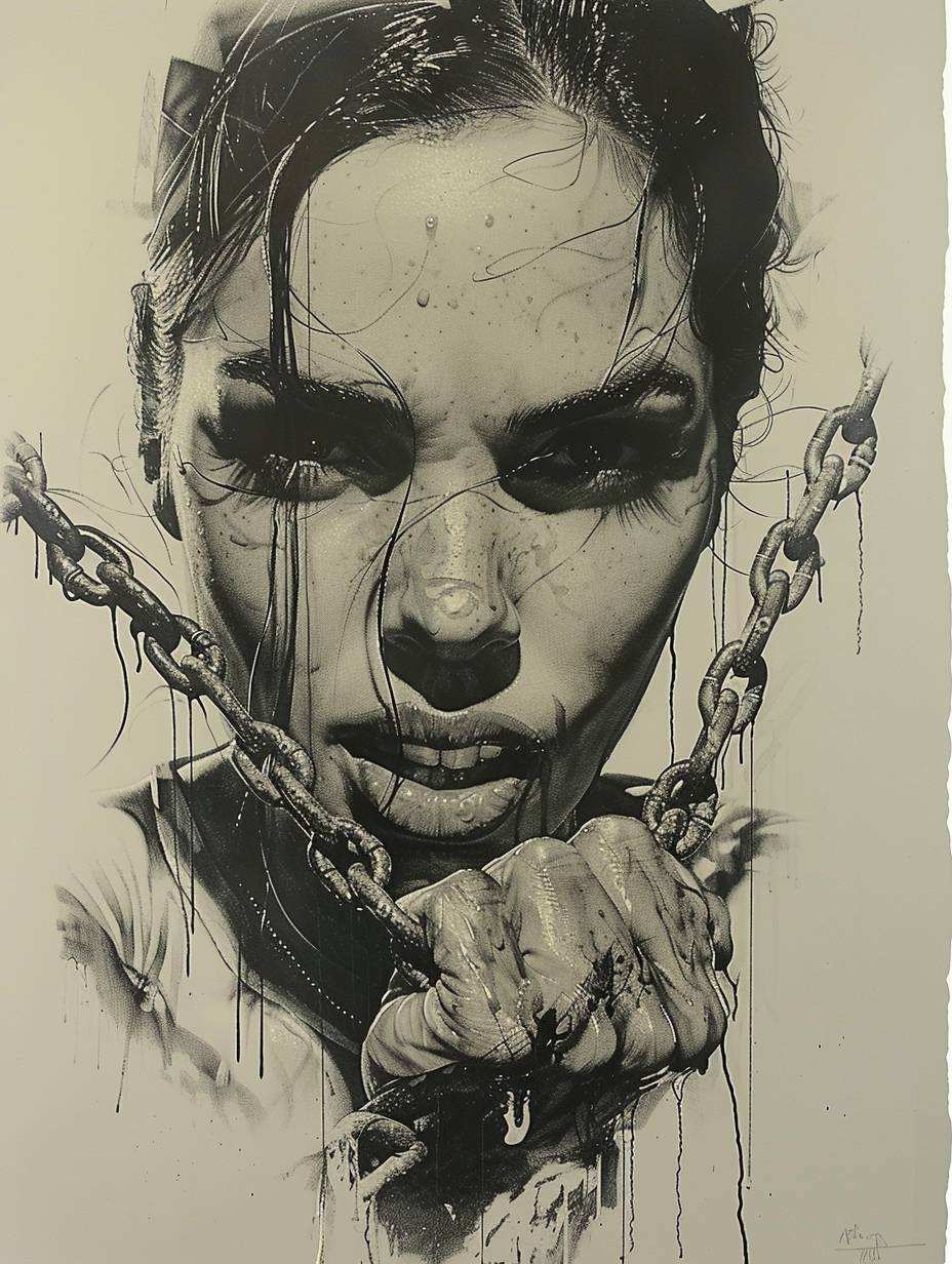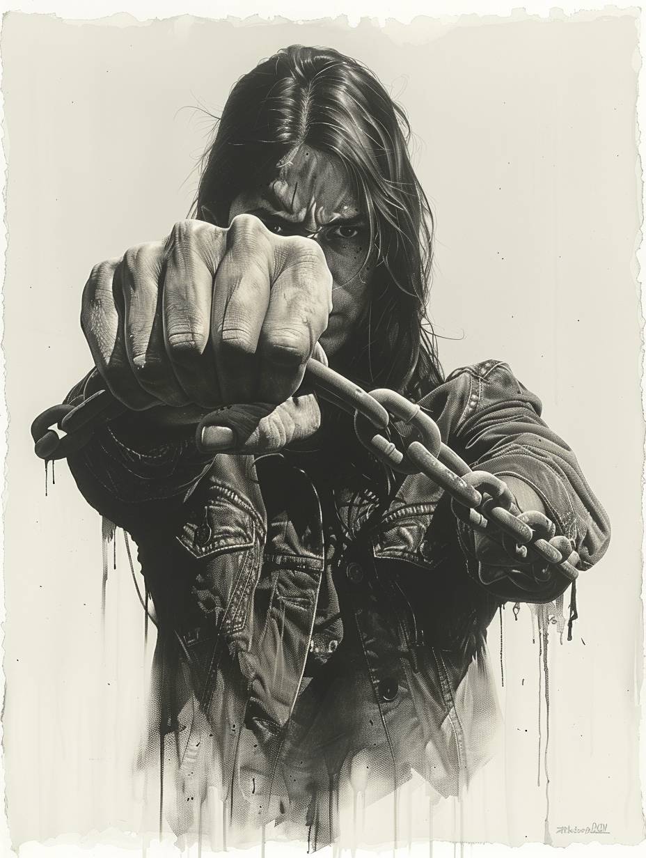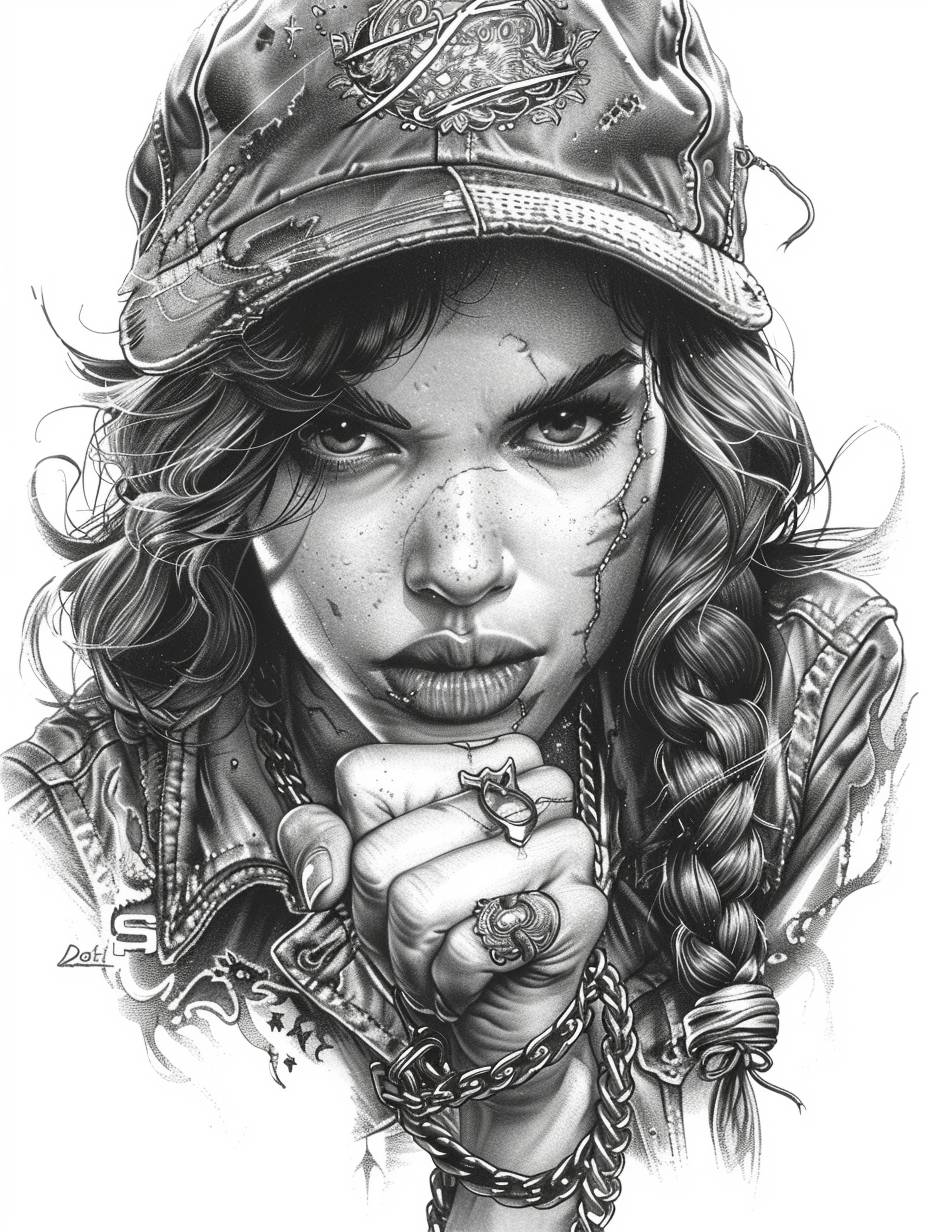 tattoo design of woman with chains wrapped around her fist, facing forward, white background, grayscale, high contrast --ar 3:4 --style raw --stylize 750 --v 6.0