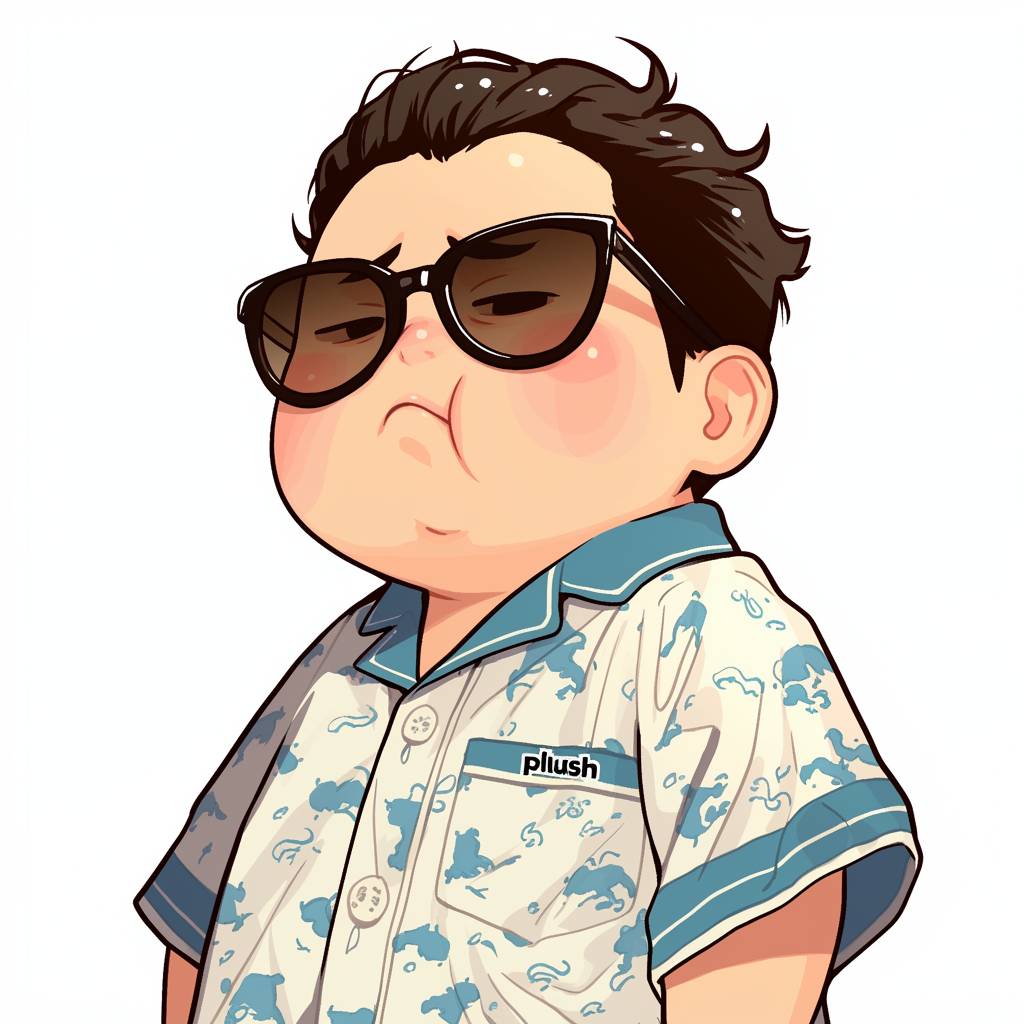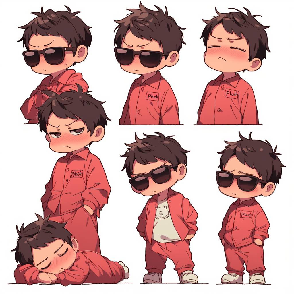 Пухлый маленький мальчик в черных солнцезащитных очках, одетый в милую 'плюшевую' пижаму. Простые выражения лица и плоский стиль иллюстрации, напоминающий японских аниме-персонажей. Чиби, чистый белый фон и простые линии. Дизайн простой, без теней на голове или теле, а детали и прически несложные. Его выражение очень печальное и передает уверенность через его лицо, эффект камеры на верхней части тела, аниме стиль, иллюстрация, стиль каракуля, чистый фон, сплошной цвет, детали, высокое качество, 8k.
