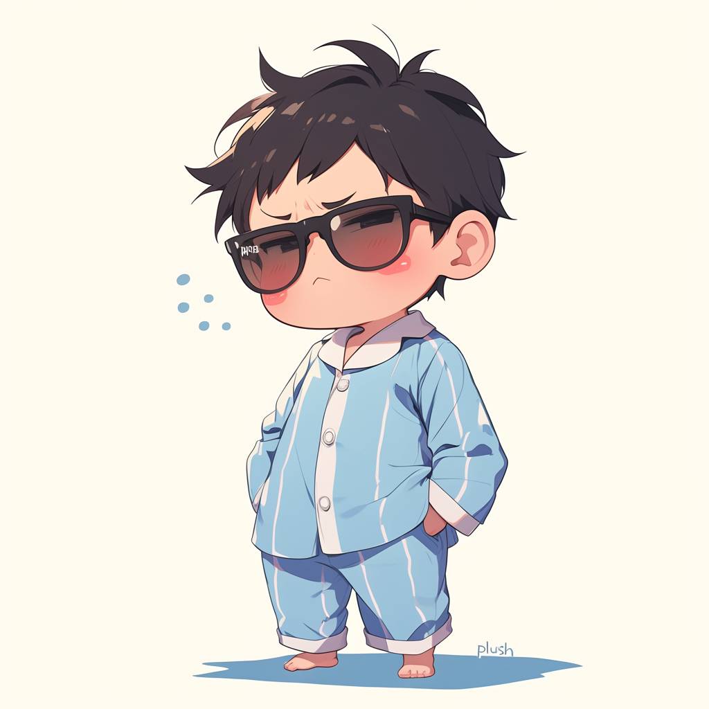 Chubby little boy in black sunglasses, the boy is wearing a cute "plush" pajamas. Simple facial expressions and a flat illustration style reminiscent of Japanese anime characters. Chibi, clean white background and simple lines. The design is simple, there are no shadows on the head or body, and the details and hairstyles are simple. His expression is very sad and conveys confidence through his face, upper body camera effect, anime style, illustration, scribbled style, clean background, solid color, detail, high quality, 8k --ar 1:1 --niji 6