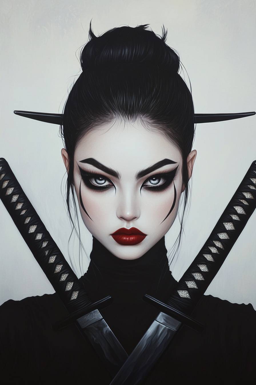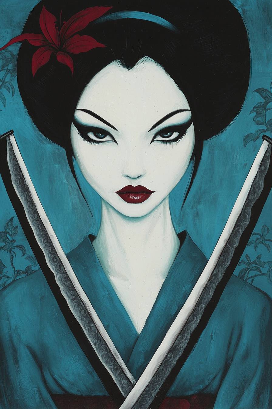 Гейша с двумя пересеченными катанами, лицо очень выразительное, на картине полностью показаны два катаны.