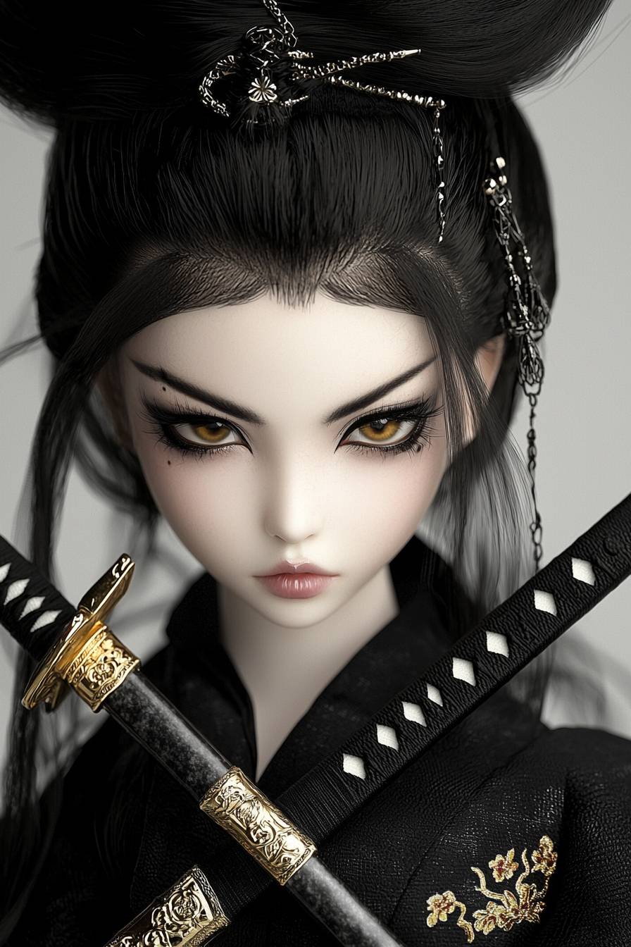 Geisha with 2 crossed katanas, very expressive face, the picture shows the 2 catanas in full, lori earley --chaos 20 --ar 2:3 --quality 2 --v 6.1