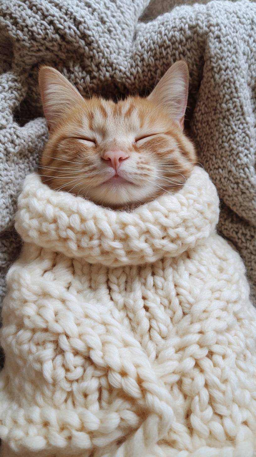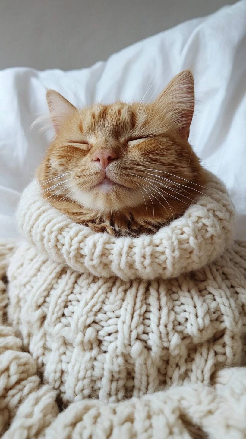 Un adorable chaton roux aux yeux fermés, allongé confortablement dans un pull en laine tricotée blanche, avec un sourire paisible et une expression sereine. Le pull est en laine épaisse et texturée, avec des mailles bien définies qui renforcent le côté cocooning et chaleureux. Le fond est flou, composé d’une couverture douce ou d’un tapis en laine dans des tons blancs ou crème. La lumière est douce et naturelle, créant une ambiance calme, réconfortante et hivernale --ar 9:16 --v 6.1