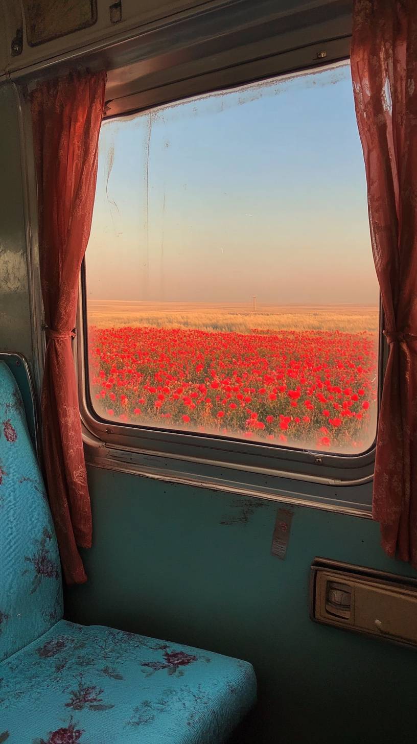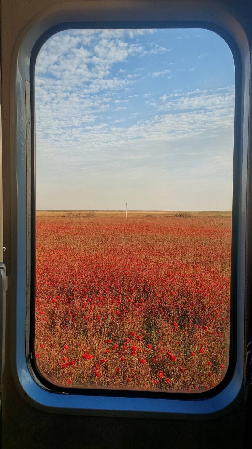 Из окна поезда видно яркое красное поле роз.