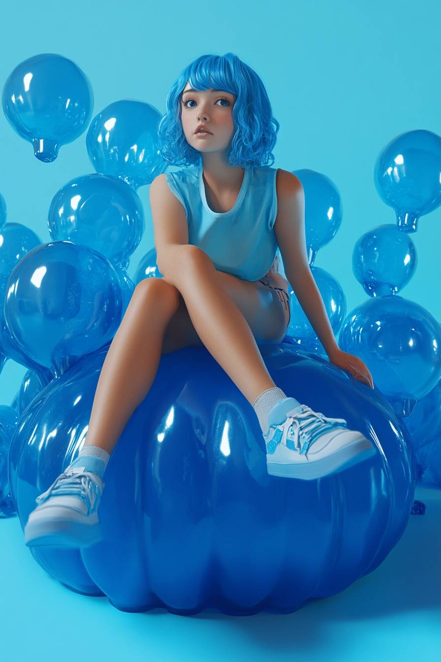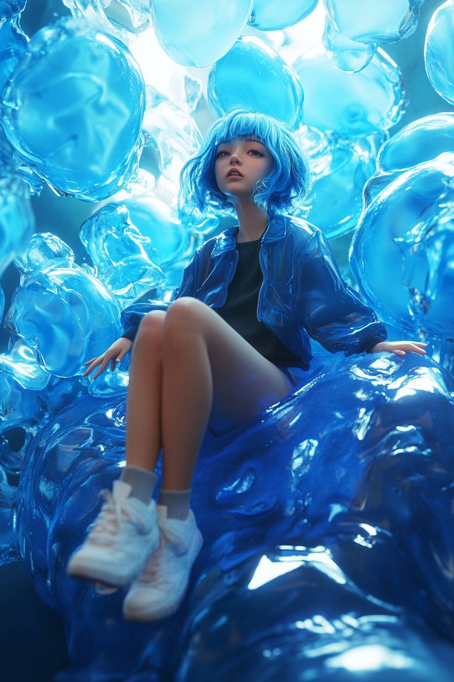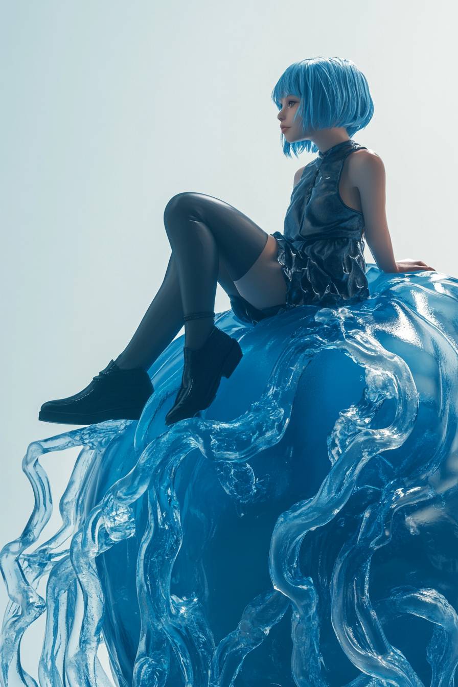 Девушка с короткими голубыми волосами сидит на большом голубом желе, в стильной динамичной позе и реалистичном стиле.