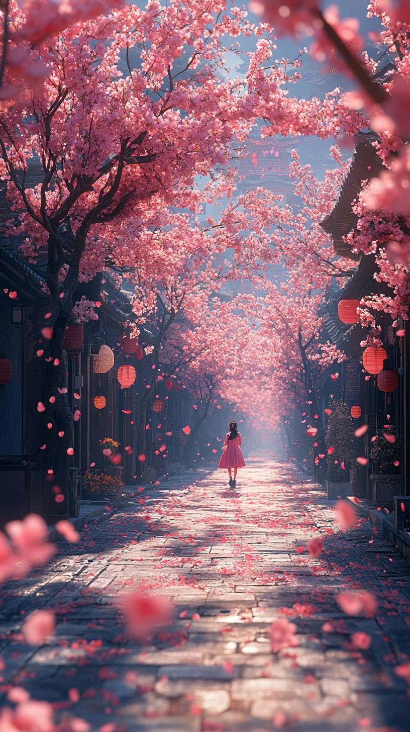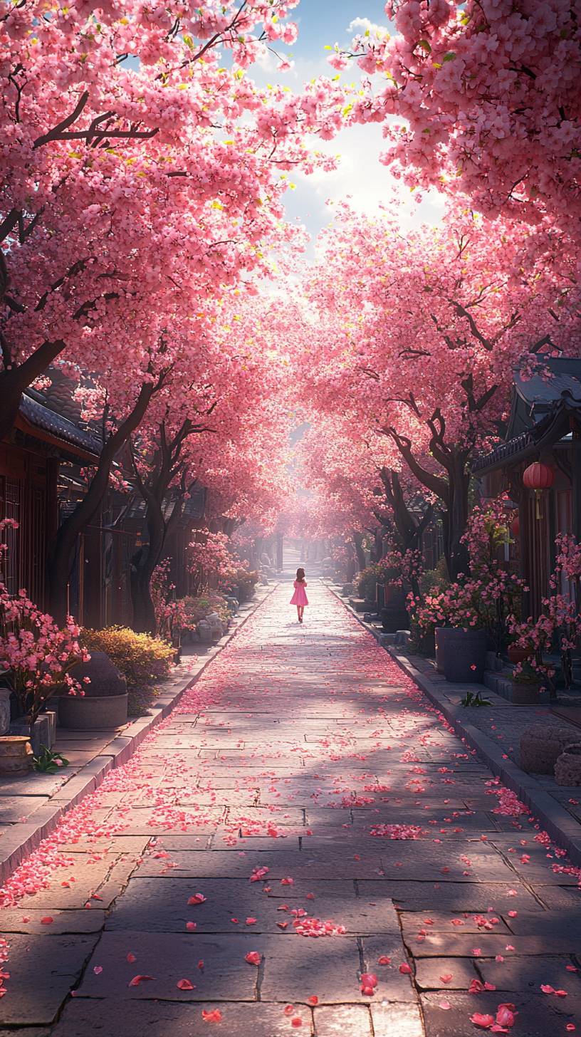 gpt-4o:On both sides of the tree-lined path, flowers are in bloom. A Chinese girl walks along the road, surrounded by the fragrance of flowers and the chirping of birds. The scene is vividly realistic and in ultra high-definition. --ar 9:16 --stylize 895 --v 6.1 --style raw