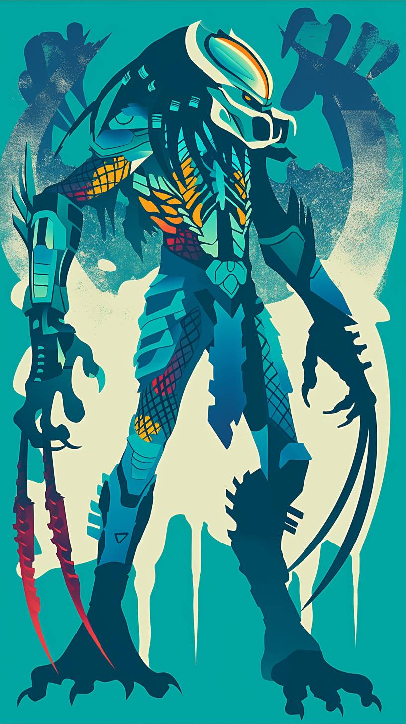 Простой рисунок Хищника с простыми линиями, плоскими цветами и фигуркой, минималистичный фон.