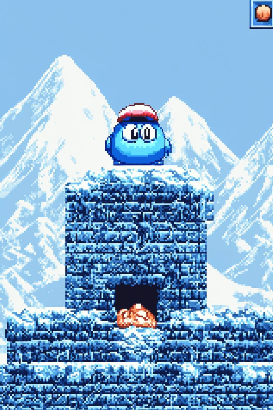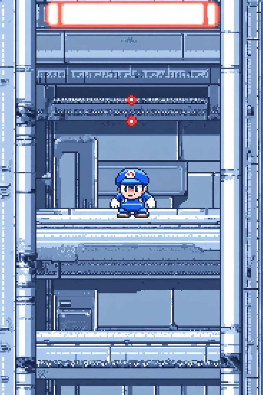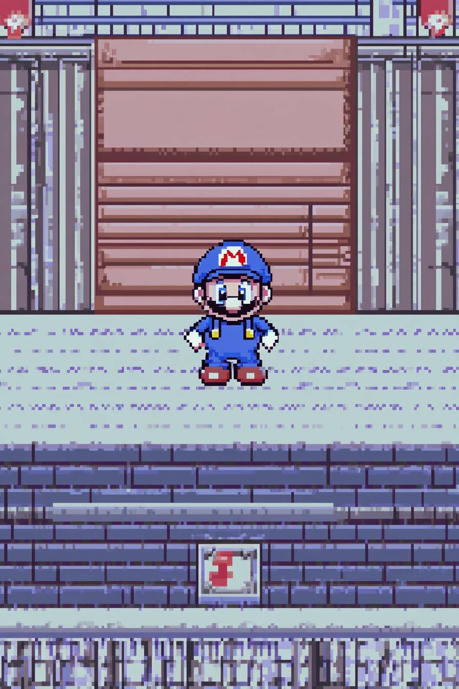 A screenshot of Super Mario Bros. on the Game Boy, featuring Doraemon as Princess Peach in his blue and white costume, standing atop an endless platform with no visible end. The game interface is simple and minimalistic, highlighting its iconic elements such as buttons for jumping or attacking enemies. A small red dot shines above their head, indicating health. This scene captures the nostalgia of retro gaming while showcasing classic video game graphics and gameplay. --v 6.1 --ar 2:3