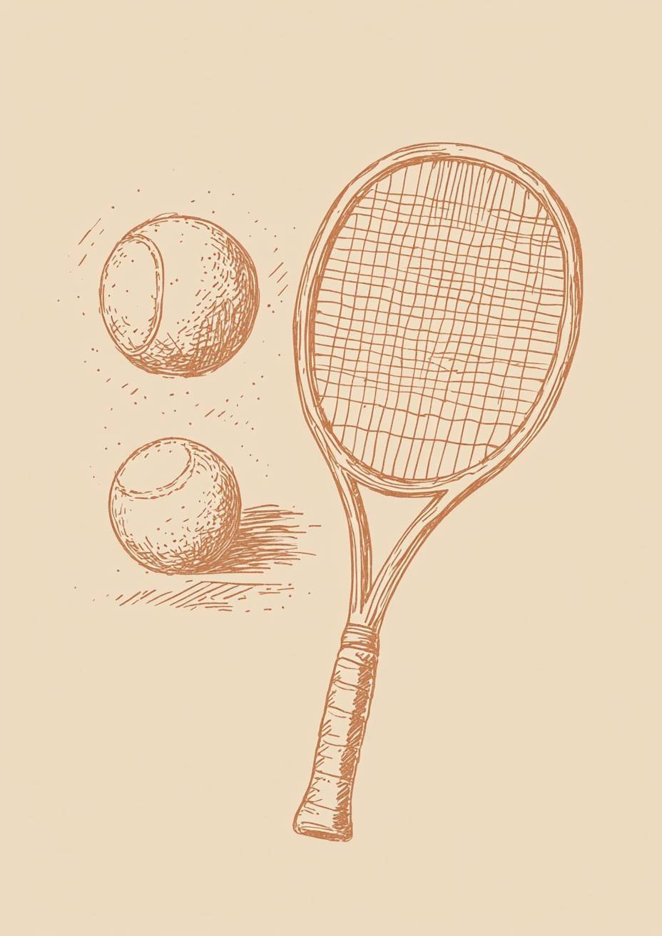Create a simple hand-drawn illustration logo for tennis, beige background, tennis racket and tennis ball --chaos 70 --ar 100:141 --style raw --profile ws8o85q --stylize 600 --weird 900 --v 6.1