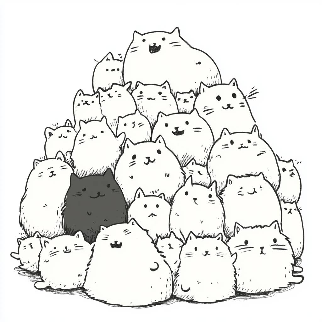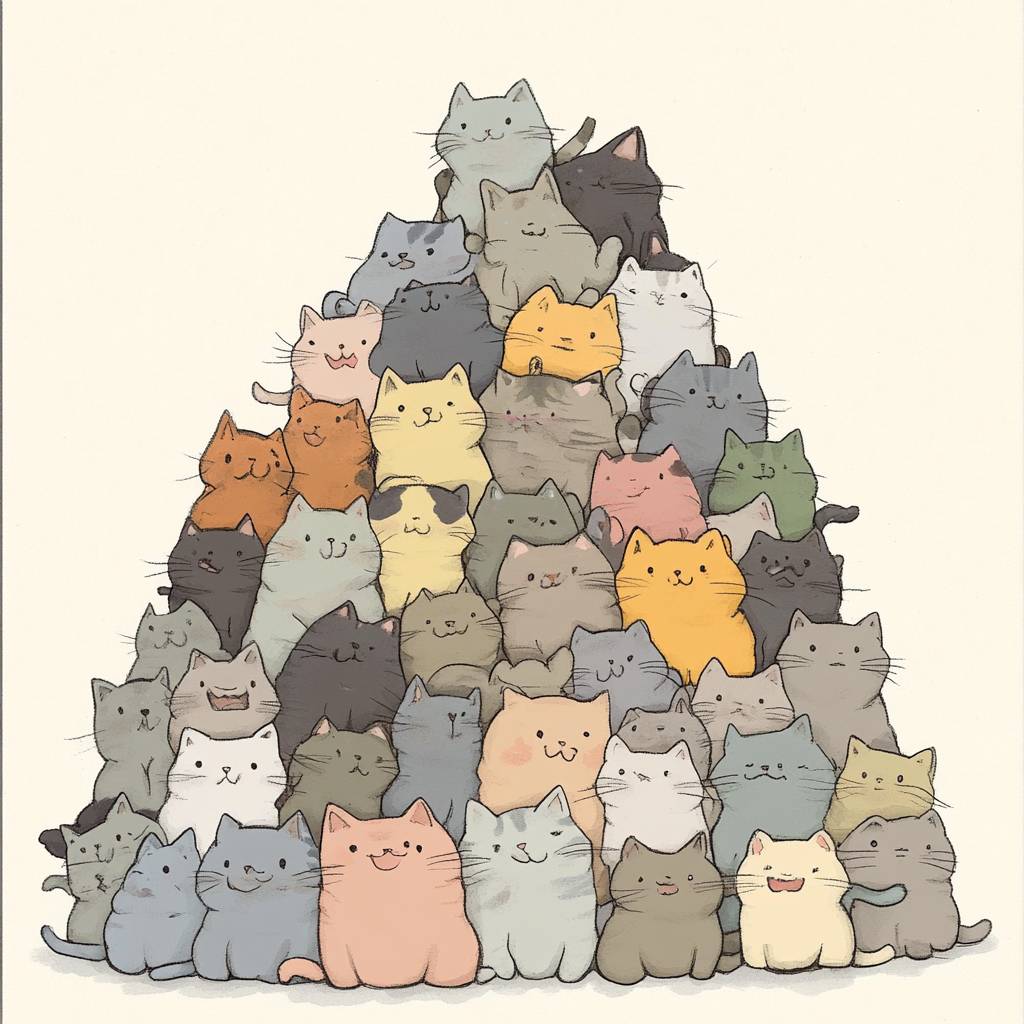 cartoon drawing, cats stacked on each other everywhere, big blob of cats --ar 1:1 --v 6.1 --style raw