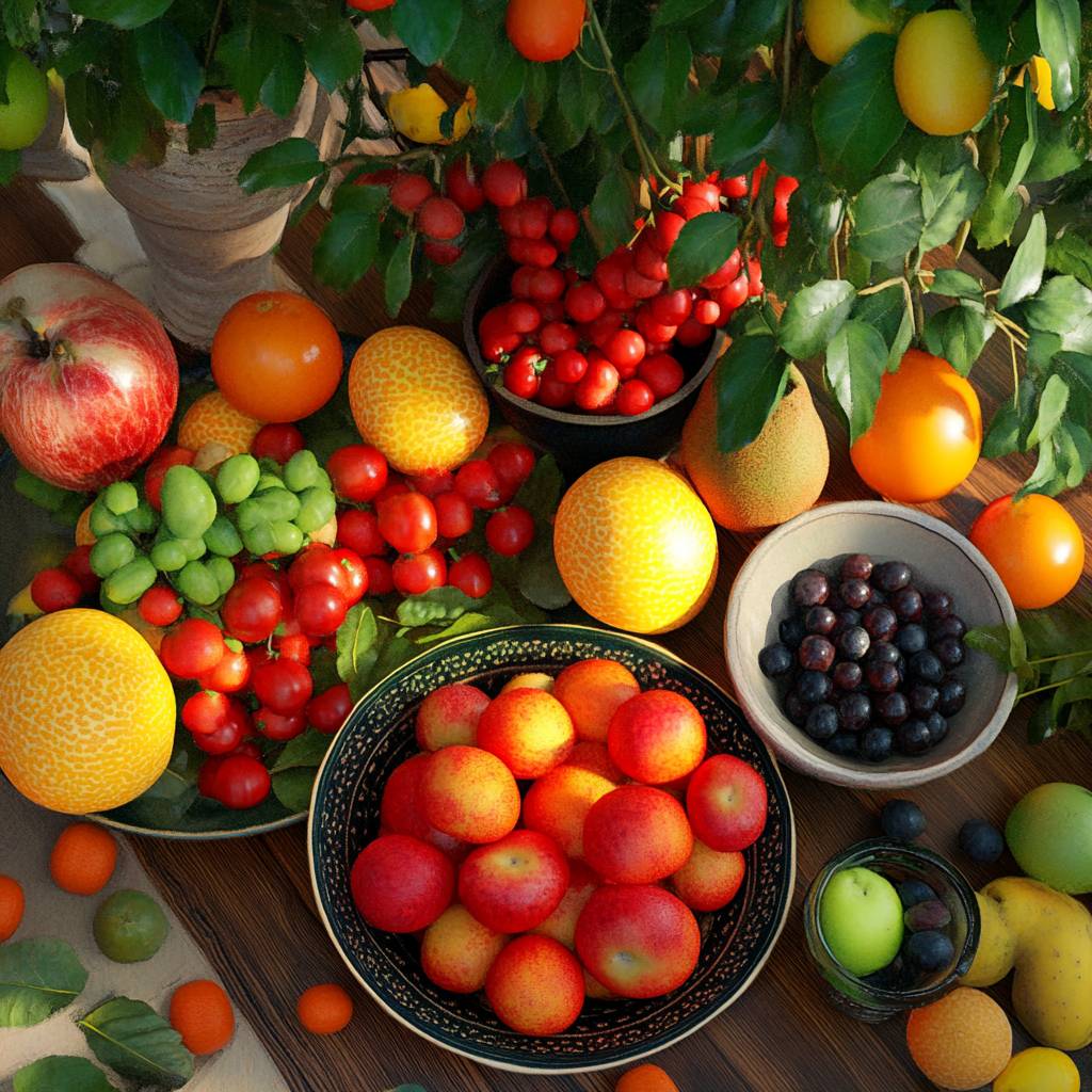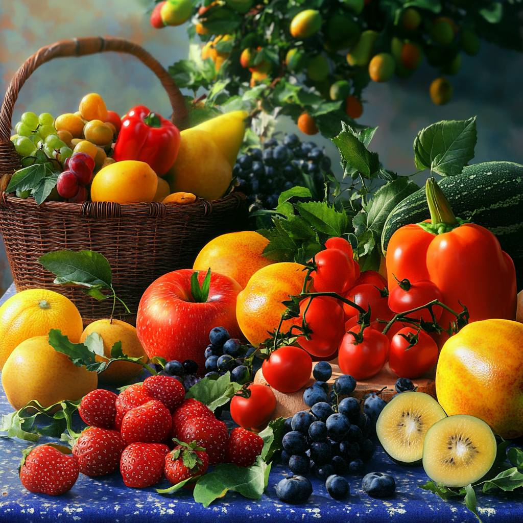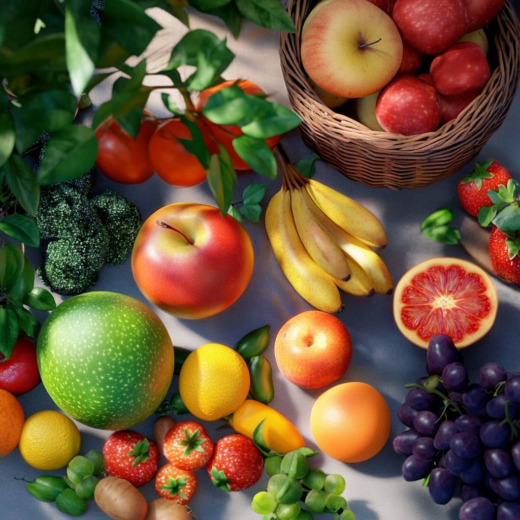 View from above of many fruits and vegetables on the table, Complex background, Front view, photoreal, realistic, hyper quality, masterpiece, Perfect Details, 8K, high detail, high resolution, Bright, Full Length Shot --profile zyorl5x --stylize 70 --v 6.1 --style raw